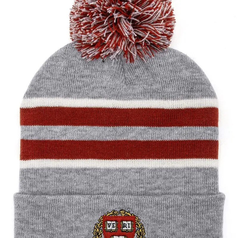 Harvard University Veritas Shield Pom Pom Beanie - Gray/Burgundy/White