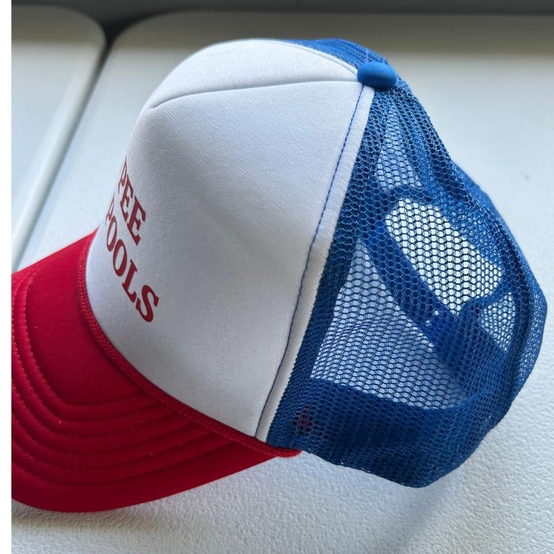 I PEE IN POOLS Trucker Hat - Unisex Blue and Red Mesh Cap with Bold Red Text Design