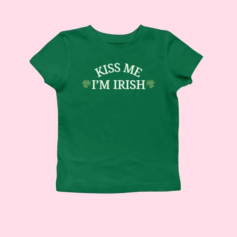 Kiss Me I_m Irish Y2K 2000's Baby Tee - Women's Fitted St Patrick's Day Baby Tee For Women - Y2K 2000's Style Y2k St Pattys Tee Shamrock Irish Tee