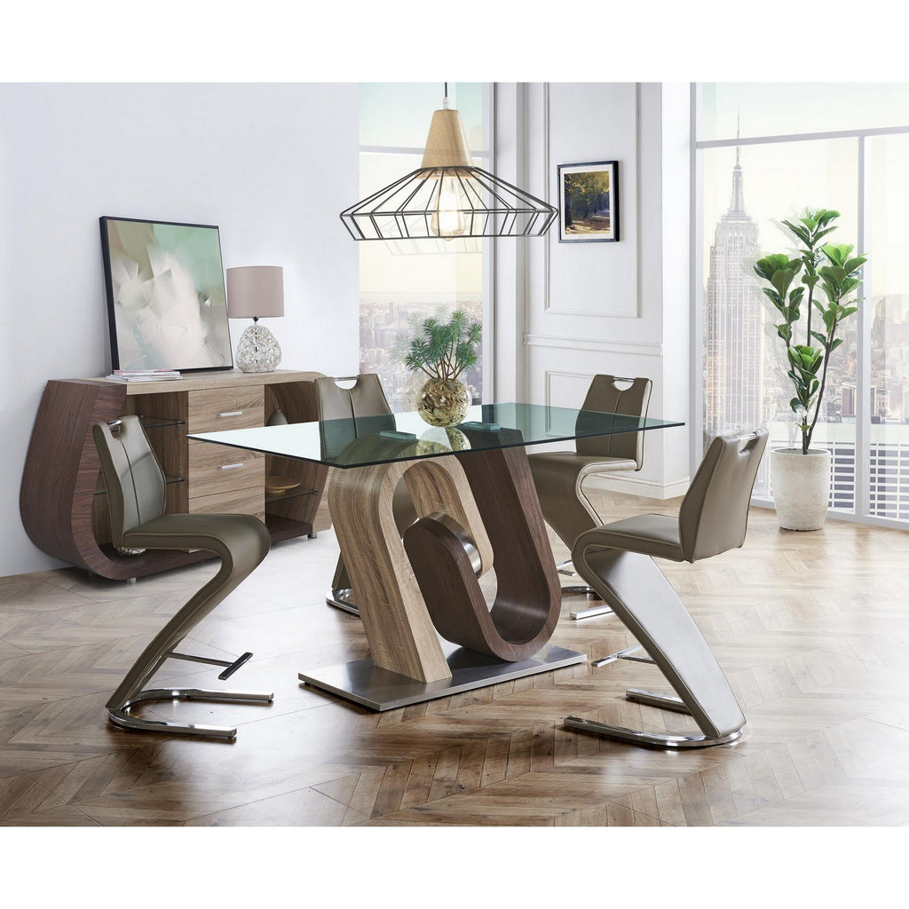 Space constraints in your dining area? Then this versatile storage buffet is the solution to all your home decorating needs. Unusual It are the hallmark of this ultra-contemporary buffet, making it immediately the eye-catching focal point of your entertainment/dining area. Storage problems disappear thanks to this buffet's abundant shelf space and drawers. Incorporating solid woods and veneers in a multi-toned oak and walnut-look finish, this buffet is an easy fit for many room decors and will add drama and sophistication to any room environment. Quality construction ensures durability and long lasting wear. This buffet is a smart choice for the discerning shopper and will give you the flexibility you need without sacrificing unique appeal.