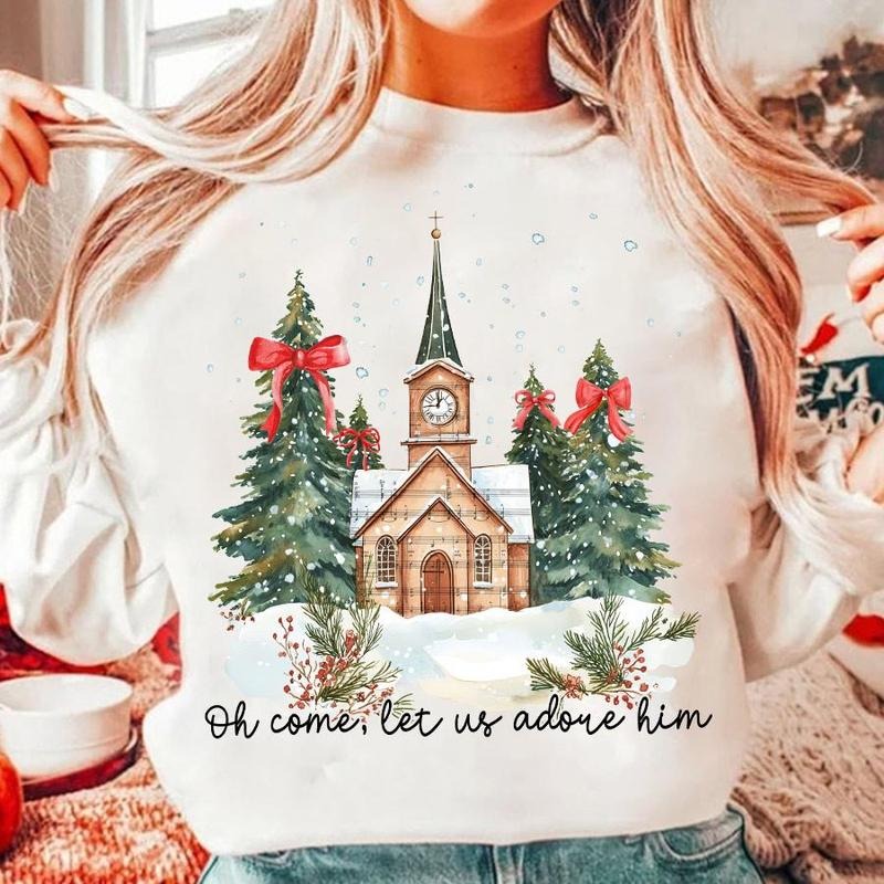 Oh Come Let Us Adore Him Shirt, Jesus Christmas Shirt, Coquette Christmas Tree, Hand Drawn, Christian Christmas Sweatshirt