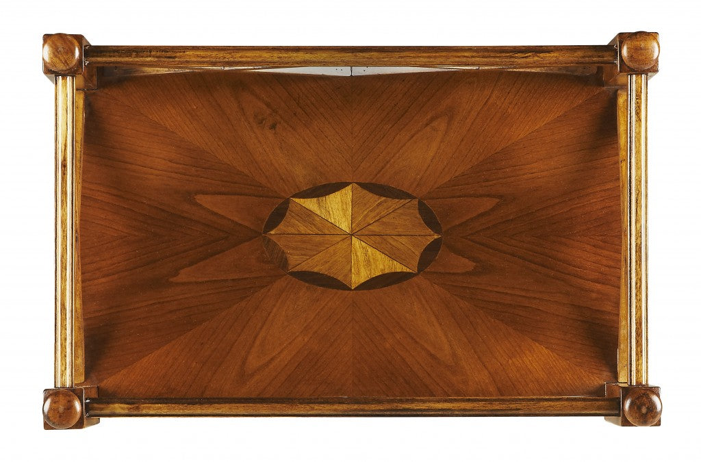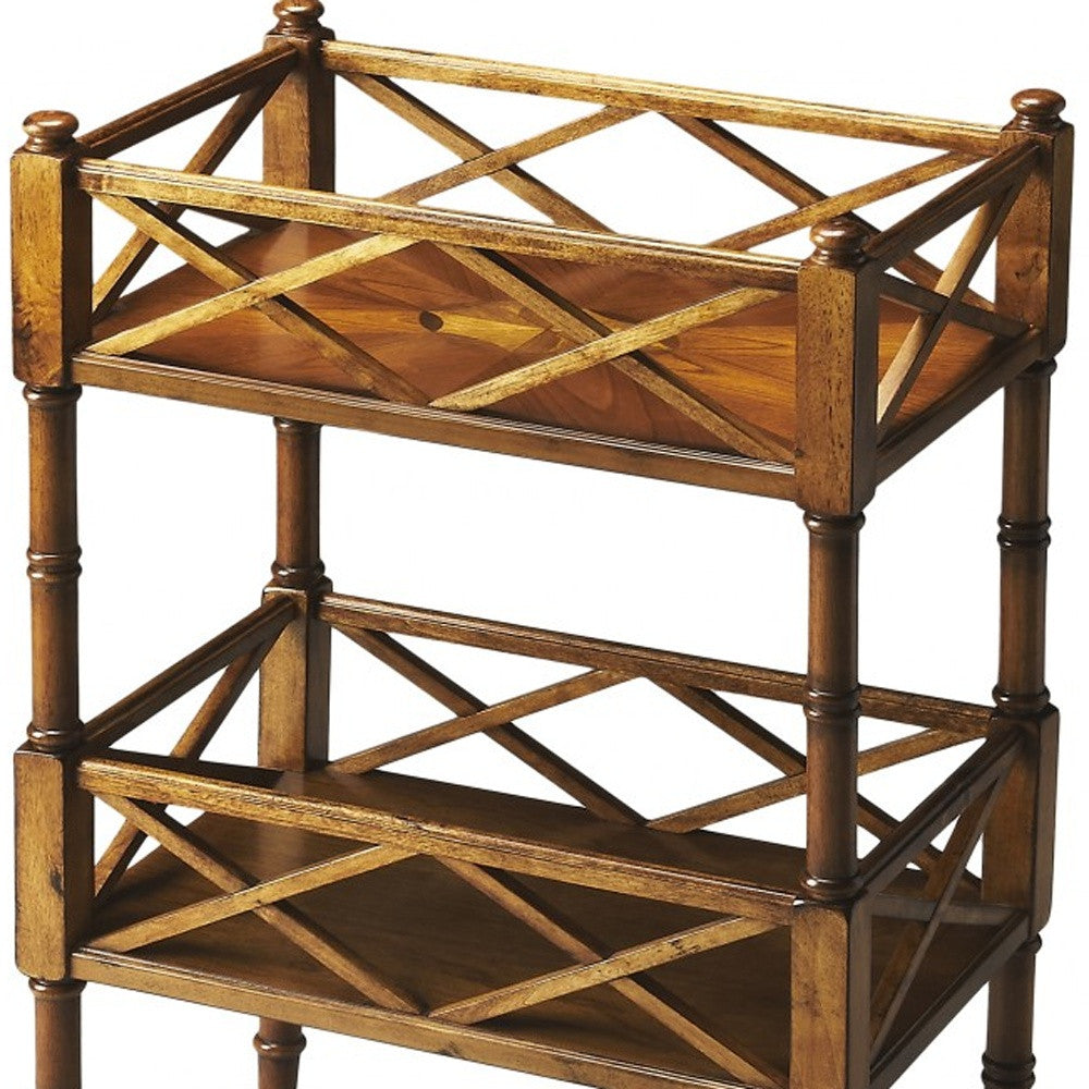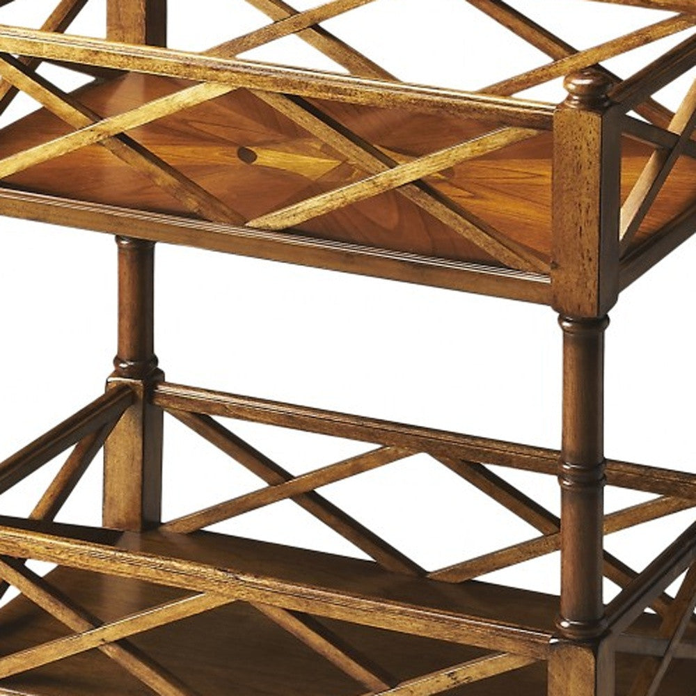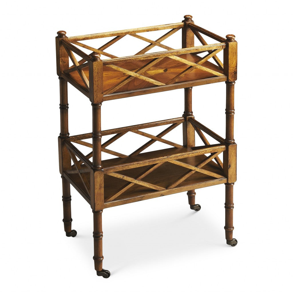 Quintessential in style is the Olive Ash Burl Mobile Server table. Crafted from selected hardwood and a matching olive ash burl veneer this server is the perfect addition to any vintage decor. The two shelves have been aesthetically designed to carry any kind of serving. Carved to perfection are the four strong pillars which conclude with brass finished casters for easy movability. 30" x 19" x 12"