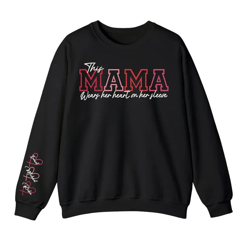 Personalized This Mama Wears Her Heart on Her Sleeve Sweatshirt Hoodie, Mama Sweatshirt with Kid Names, Custom Shirt for Mom, Mothers Day Gift, New Mom Gift