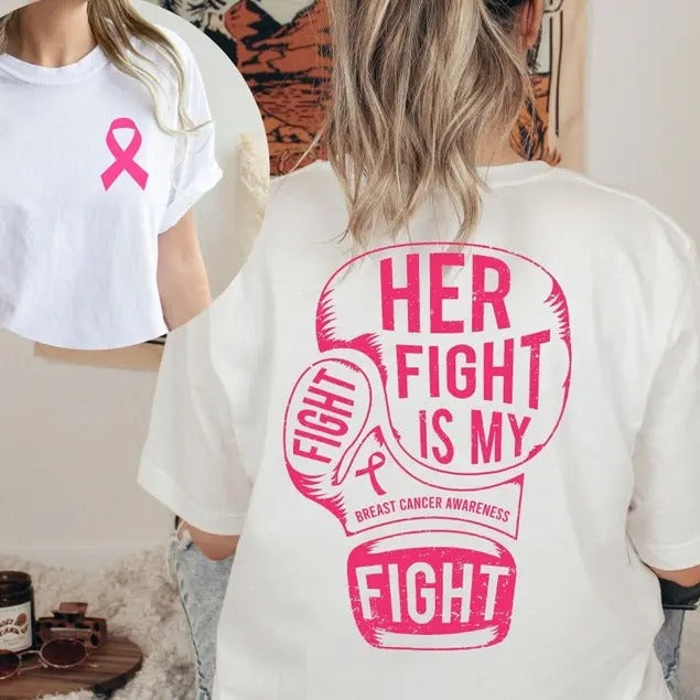 Pink Ribbons Her Figth Is My Fight Breast Cancer T-shirt 2 Sides, Breast Cancer Awareness Shirt, Breast Cancer Warrior T-shirt, Cancer Fighter Support Team Shirt, Fighter Tee, Cancer Gift for men and women