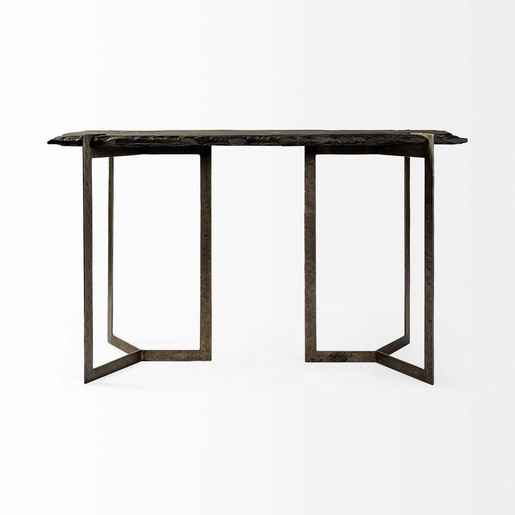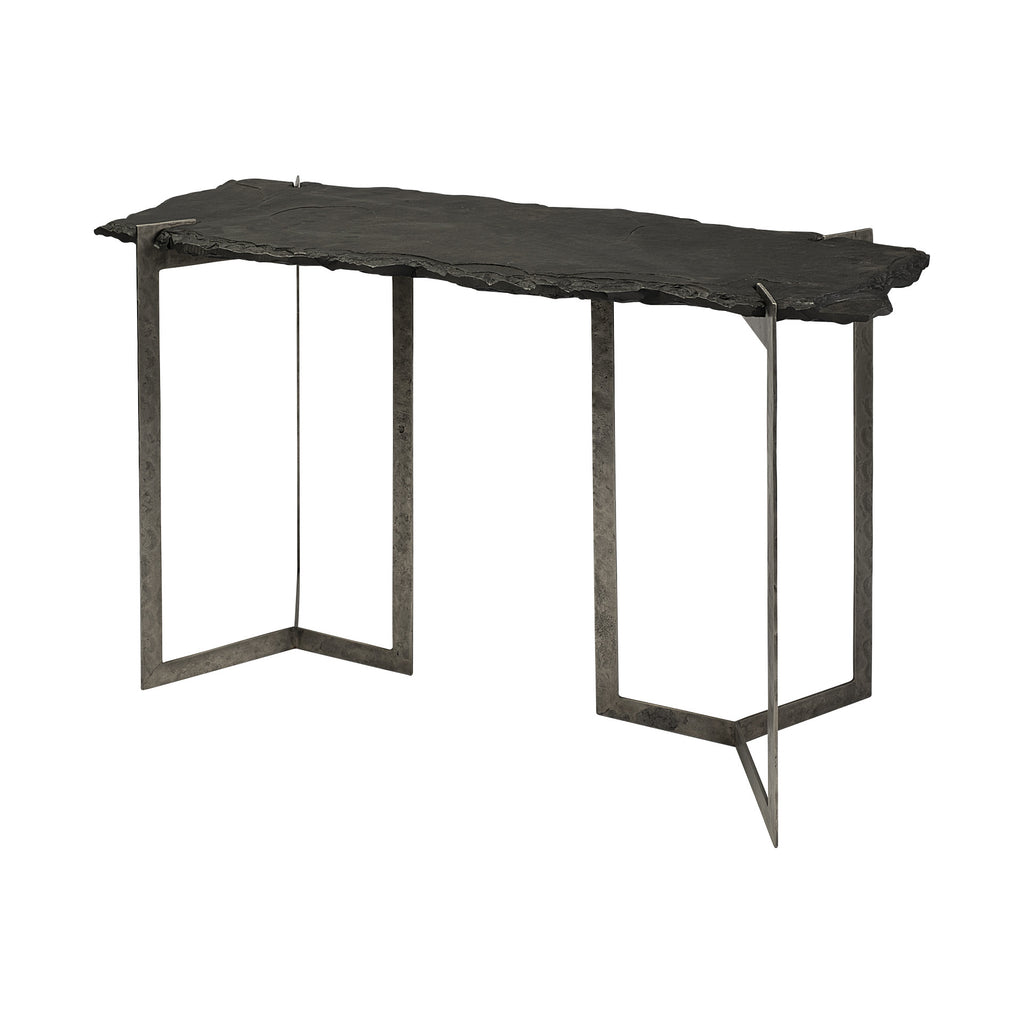 The is a truly unique console table featuring a live-edge slate top braced by a flat iron, double pedestal base.