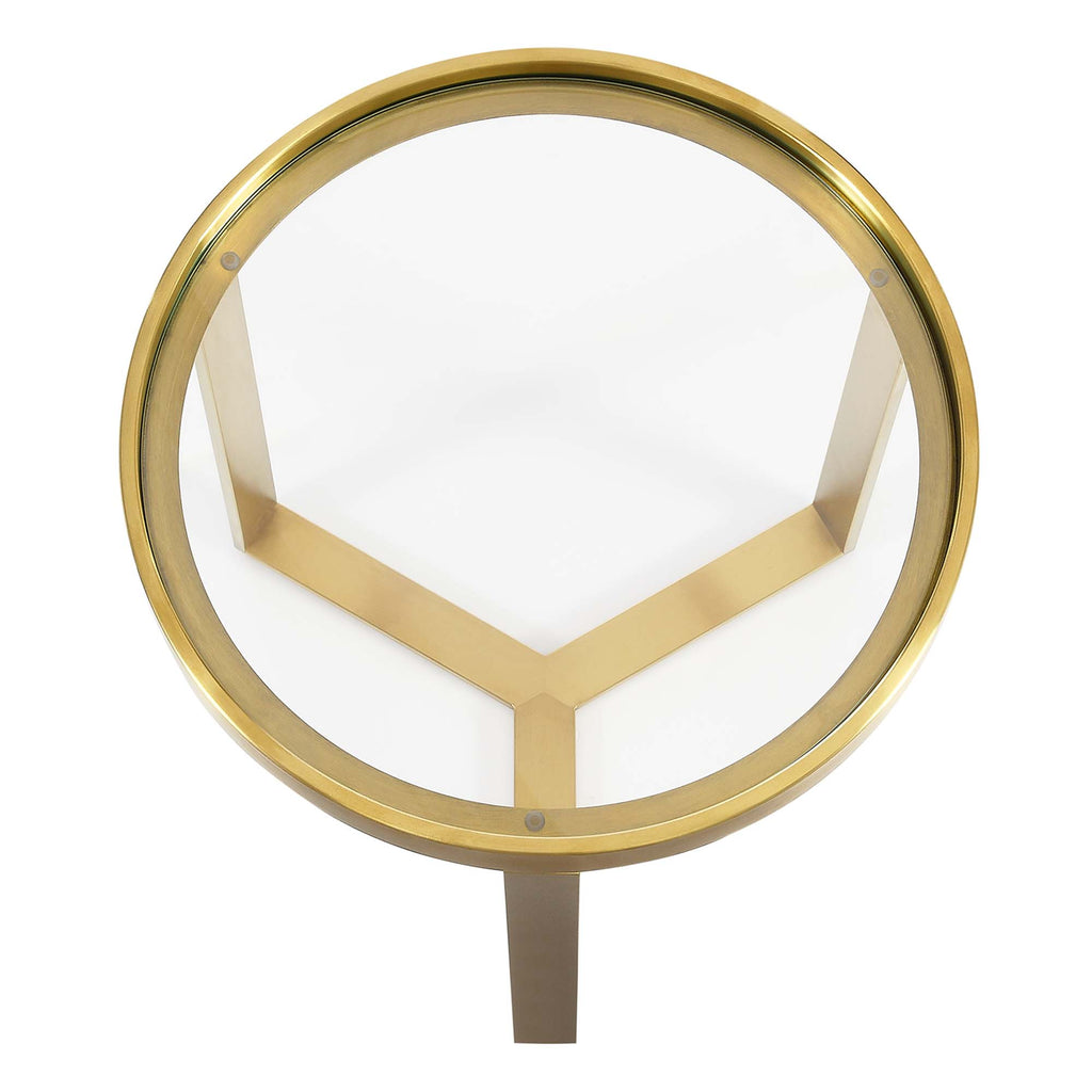 Lighten up your living space with the modern design of the Relay Side Table. A brushed gold frame encircles a round piece of tempered glass for a clear tabletop that brightens any room. This end table is the perfect addition situated next to a living room sofa, armchair in the entryway, or lounge chair in a reading nook, and can even serve as an understated nightstand in a guest bedroom. Relay includes adjustable non-marking foot caps to protect flooring and provide added stability on uneven surfaces. Assembly required. Weight Capacity: 300 lbs. Set Includes: One - Relay Side Table