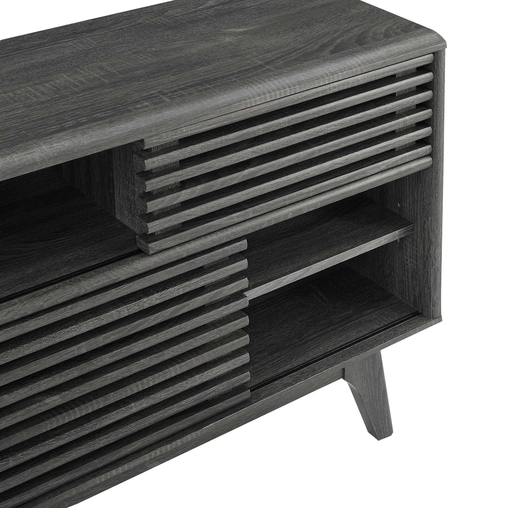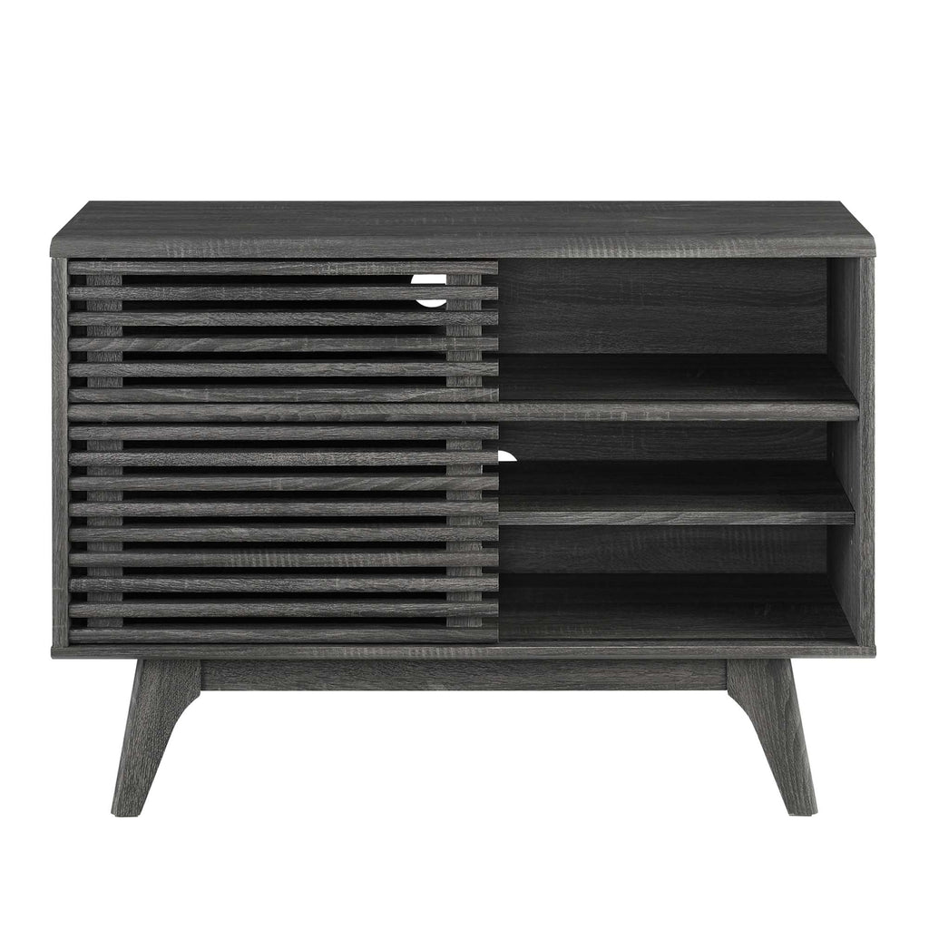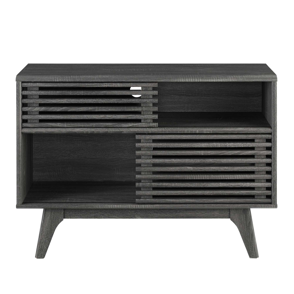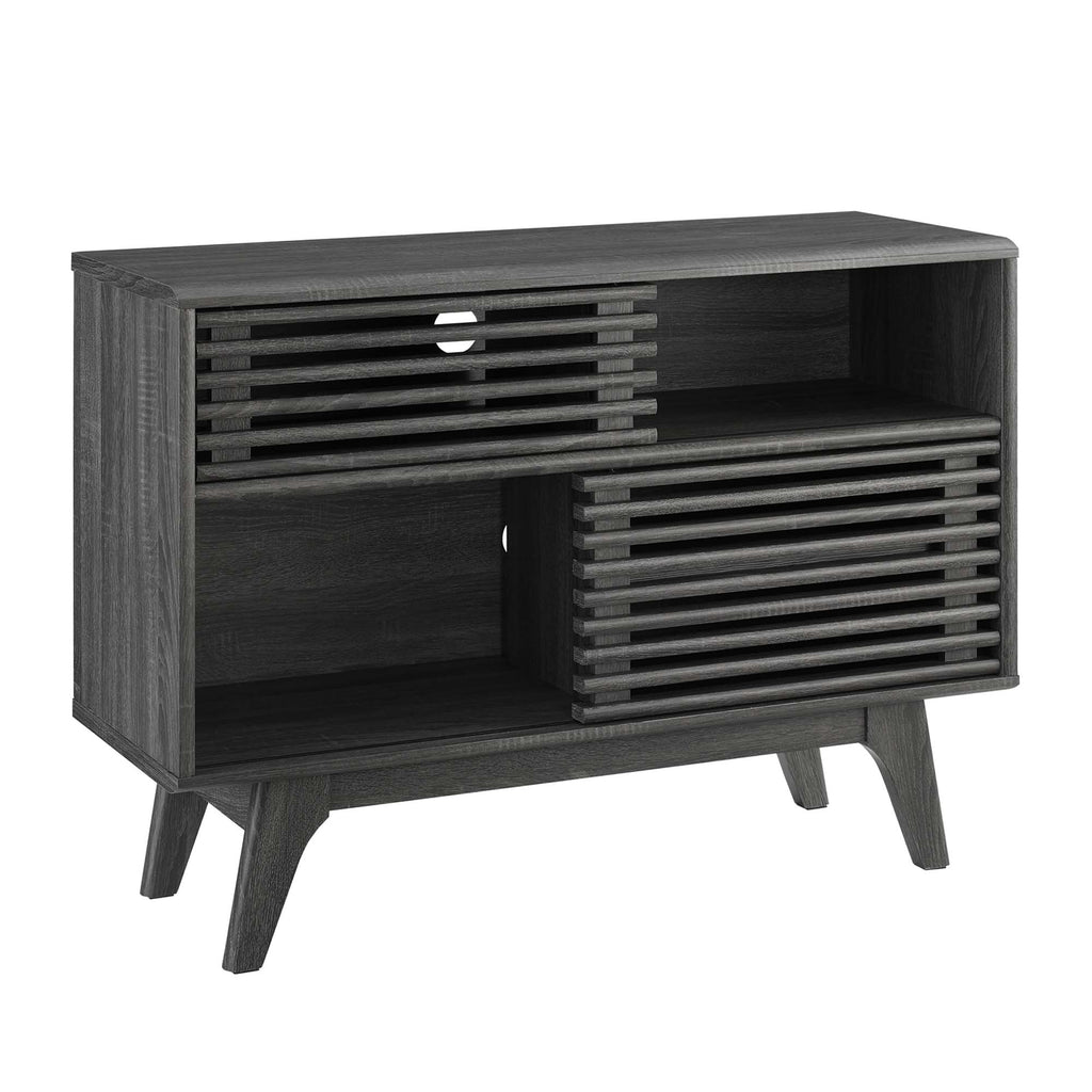 Tap into mid-century aesthetics with the Render Display Stand. Render features a durable particleboard frame with smooth walnut grain laminate, four tapered wood legs, four storage spaces with an adjustable shelf in the lower right section, non-marking foam foot pads, and dual slatted sliding doors for sophisticated living room or entryway storage. Complete with cable management holes on both sides, Render�s contemporary linear style is the perfect display stand for books, magazines, pictures, table lamps, and indoor plants. Set Includes: One - Render Display Stand
