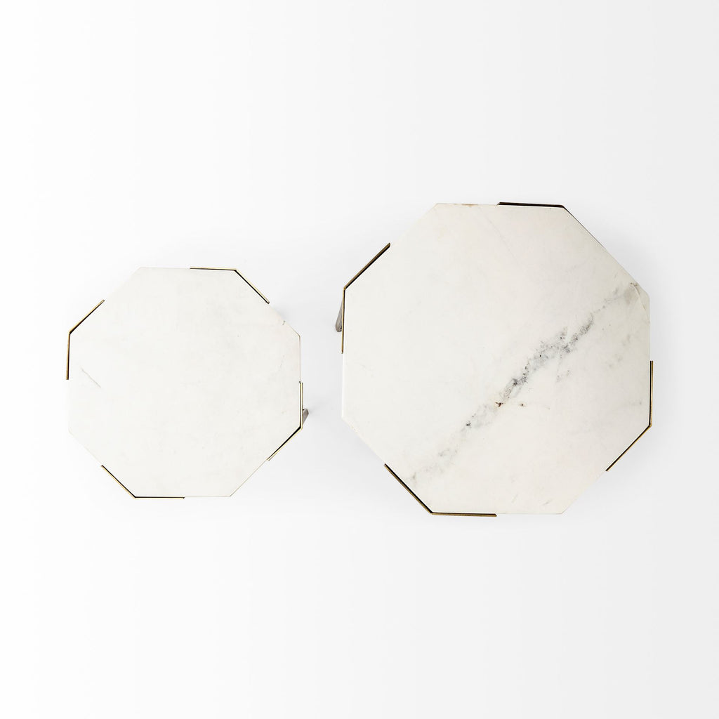 Set Of 2 White Marble And Iron Hexagonal Top Side Tables