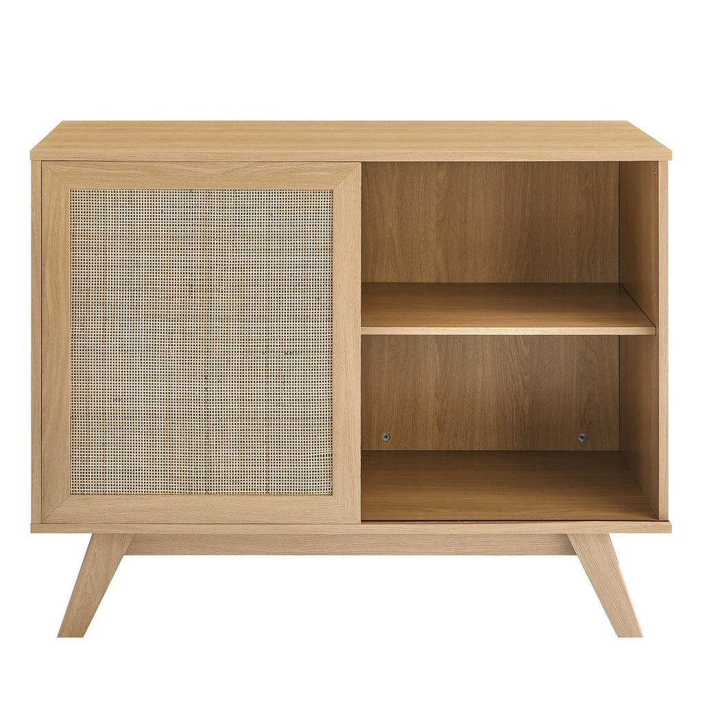 Introduce refreshing style to your living space with the Soma 40" Accent Cabinet. Showcasing a beautiful rattan weave on the sliding door, this entryway cabinet features three pull-out drawers and an open shelving unit that provides ample display and storage space for dining and living essentials. This versatile accent cabinet brings organic aesthetics and modern functionality to the living room, dining room, lounge area, entryway, or home office. Crafted from durable MDF and particleboard with a natural wood grain design, this display stand is complete with splayed legs and non-marking foot caps to protect flooring. Assembly required. Weight Capacity: 163 lbs. Set Includes: One - Soma 40" Accent Cabinet