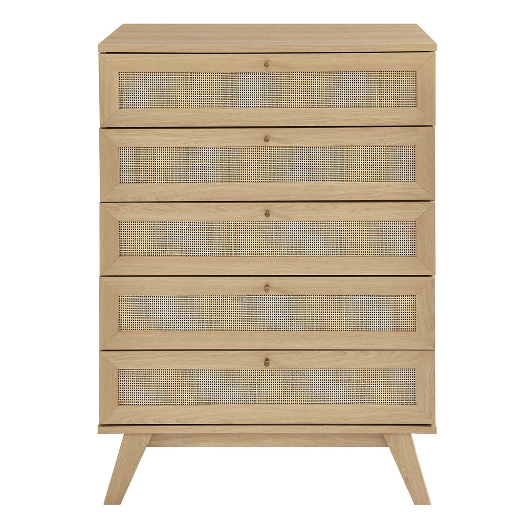 Introduce refreshing style to a primary or guest bedroom with the Soma 5-Drawer Chest. Showcasing a beautiful rattan weave on the squared drawer fronts, this chest of drawers brings organic aesthetics and modern functionality to a bedroom space. This tall dresser is crafted from durable MDF and particleboard with a natural wood grain finish. This bedroom chest is complete with five full-extension glide drawers to offer ample storage space for bedroom essentials, clothes, linens, and more. Resting on splayed legs, Soma includes non-marking foot pads to protect flooring. Assembly required. Set Includes: One - Soma 5-Drawer Chest