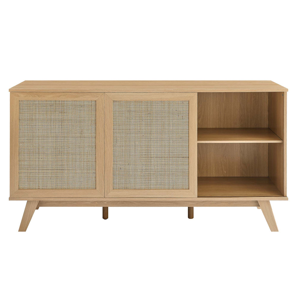 Introduce refreshing style to your living space with the Soma 59" Sideboard. Showcasing a beautiful rattan weave on the sliding doors, this display stand features three pull-out drawers and two open shelving units that provide ample display and storage space for dining and living essentials. This buffet table brings organic aesthetics and modern functionality to the living room, dining room, lounge area, entryway or home office. A versatile addition, Soma doubles as a 59" high TV stand that can accommodate TVs up to 65 inches. Crafted from durable MDF and particleboard with a natural wood grain design, this sideboard is complete with splayed legs and non-marking foot caps to protect flooring. Assembly required. Weight Capacity: 228 lbs. Please Note: When placing the TV directly on the unit, we recommend anchoring it in place. Set Includes: One - Soma 59" Sideboard