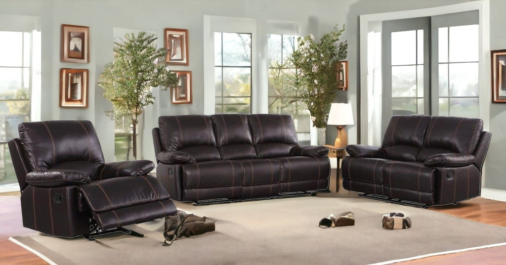 Step into a world of unparalleled seating comfort that is sure to dazzle even the toughest critic with our remarkable three piece indoor brown faux leather six person seating set. Prepare to enter the realm of ultimate relaxation with this reclining sofa that offers unparalleled comfort and luxurious lounging. Discover seating sets crafted with faux leather that prioritize both comfort and durability, allowing you to relax and unwind in style without compromising on quality. The presence of coil spring seat construction helps distribute weight evenly, reducing pressure points and enhancing overall comfort by minimizing the strain on specific areas of the body. The inclusion of a loveseat into your mix allows a fashionable seating option in a compact design. Enjoy the convenience of cabinet storage, as it offers ample space to keep your items neatly organized and out of sight. Chock full of value, this set has it all. 41-inch H x 271-inch W x 40-inch D