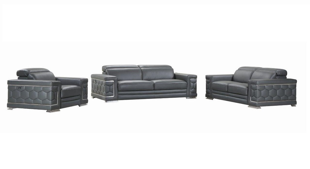 Step into a world of unparalleled seating comfort that is sure to dazzle even the toughest critic with our remarkable three piece indoor dark gray italian leather six person seating set. Upholstered in supple and luxurious genuine leather, this set has a rich and warm appeal. The presence of coil spring seat construction helps distribute weight evenly, reducing pressure points and enhancing overall comfort by minimizing the strain on specific areas of the body. The inclusion of a loveseat into your mix allows a fashionable seating option in a compact design. Gather with family and loved ones with this seating set that will bring you all together. 29-inch H x 225-inch W x 41-inch D