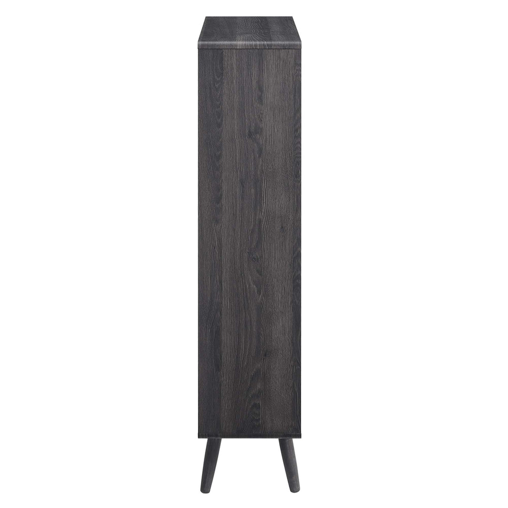 Refresh your home decor with the Transmit Wood Grain Bookcase. Crafted from durable particleboard with a wood grain finish, this three-tiered unit stands proudly on four splayed dowel legs. Its unique shelf layout offers a contemporary touch, providing five open display areas. Whether placed in a living room, hallway, entryway, or office, this modern bookcase effortlessly transforms any empty space into a stylish spot for showcasing books, photos, accent pieces, and cherished collectibles. Assembly Required. Weight Capacity: Top - 70 lbs; Top Shelves - 44 lbs each; Middle Shelf - 68 lbs; Bottom Shelves - 44 lbs each. Set Includes: One - Transmit 5 Shelf Bookcase