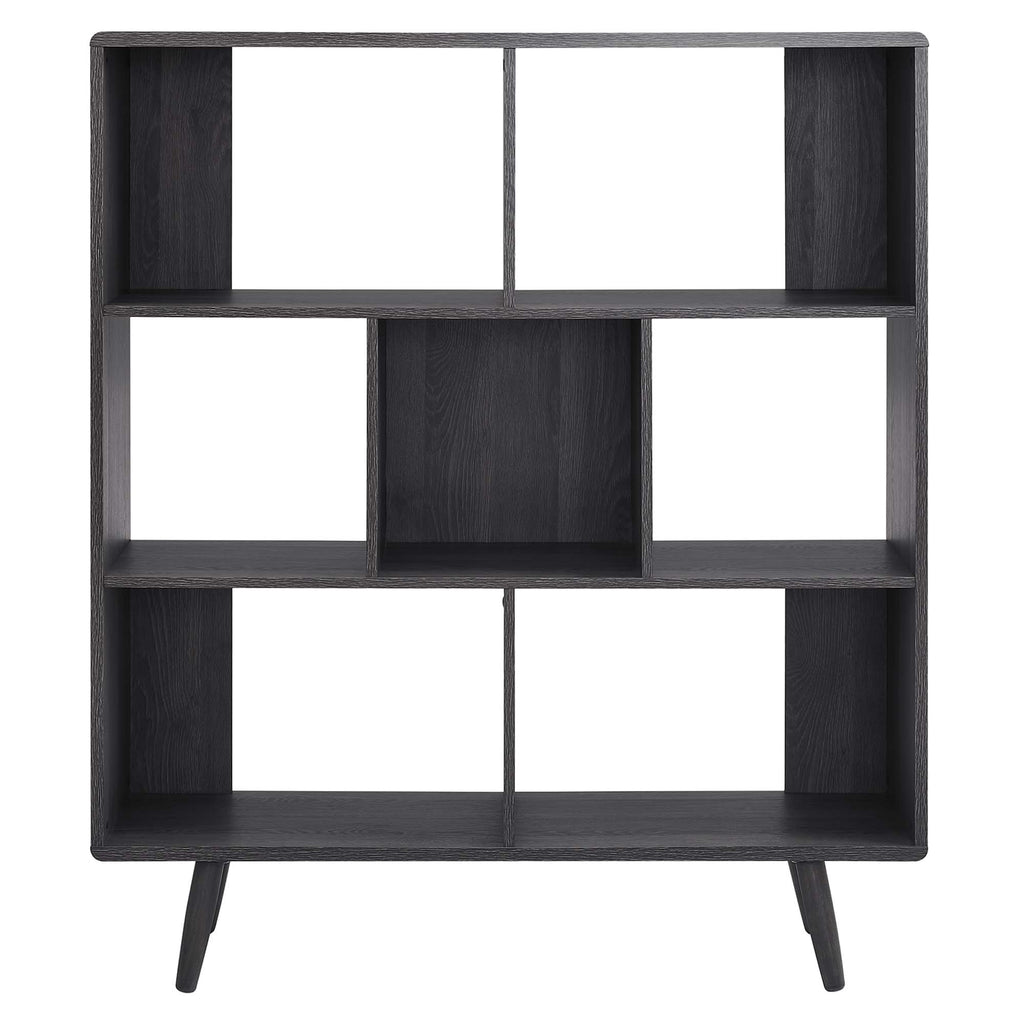 Refresh your home decor with the Transmit Wood Grain Bookcase. Crafted from durable particleboard with a wood grain finish, this three-tiered unit stands proudly on four splayed dowel legs. Its unique shelf layout offers a contemporary touch, providing seven open display areas. Whether placed in a living room, hallway, entryway, or office, this modern bookcase effortlessly transforms any empty space into a stylish spot for showcasing books, photos, accent pieces, and cherished collectibles. Assembly Required. Weight Capacity: Top - 93 lbs; Top Shelves - 55 lbs each; Middle Shelves - 44 lbs each; Bottom Shelves - 55 lbs each. Set Includes: One - Transmit 7 Shelf Bookcase