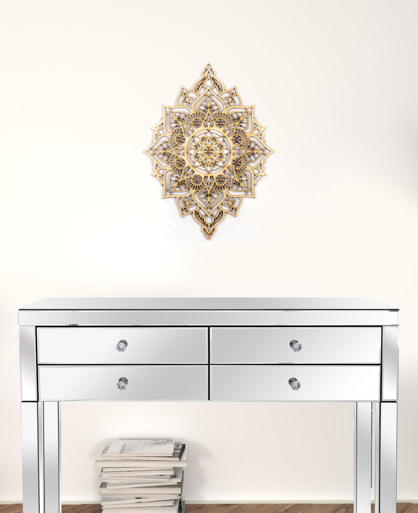 Unique and decorative, this turquoise and gold color solid wood geometric shapes wall decor will add a beautiful decorative accent to your decor. This hand painted laser cut wood morning star mandala will bring cool bohemian vibes to your space and be a unique and fun way to decorate your walls. Hang on your wall to add some up to date fashion and decoration. Utilize this opportunity to create a focal point in the room with this fabulous geometric wall decor option. 21" H x 16" W x 0.25" D