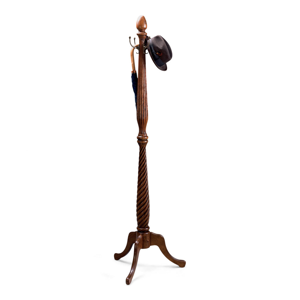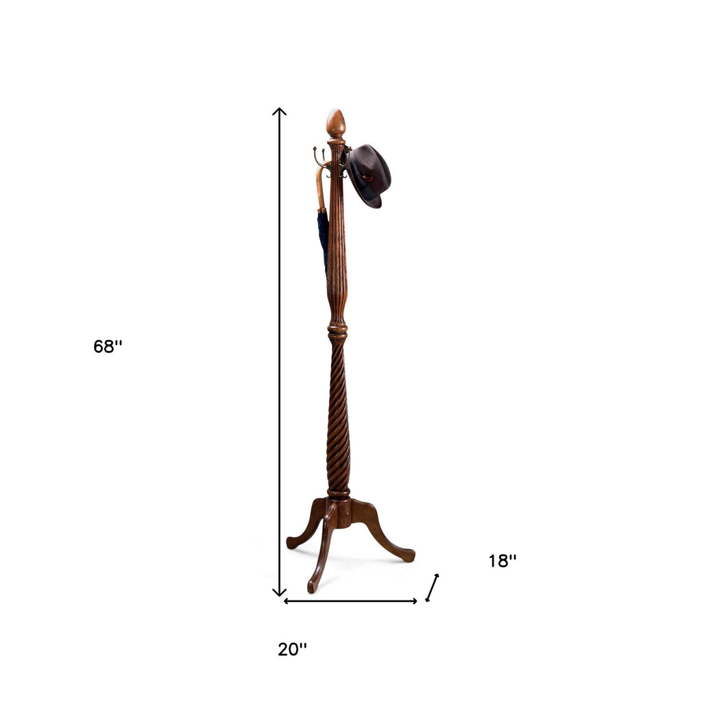 Decorate your house or office elegantly with this Unique Hand Carved Wooden Coat and Hat Rack. This appealing wooden rack in a traditional style and cherry finish features sturdy and practical hooks that allow you to hang various clothing items such as coats and jackets along with other accessories such as scarves, hats, bags, briefcases, laptop bags and umbrellas. The multiple brass plated hooks help to disperse pressure evenly for balance, while the strong wooden pole and base create stability and sturdiness, making it easy to hold heavy coats, jackets and suits. 68” H. 20” W. 18” D