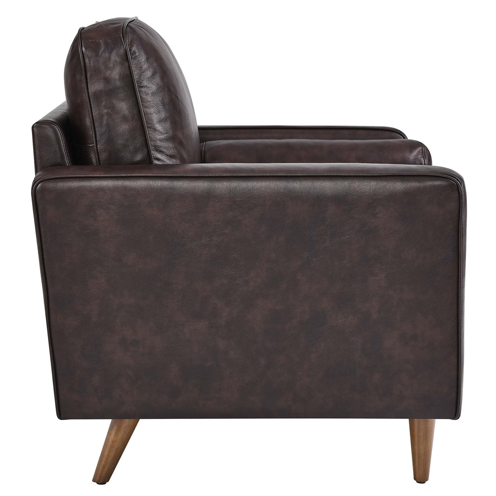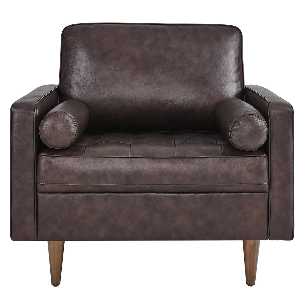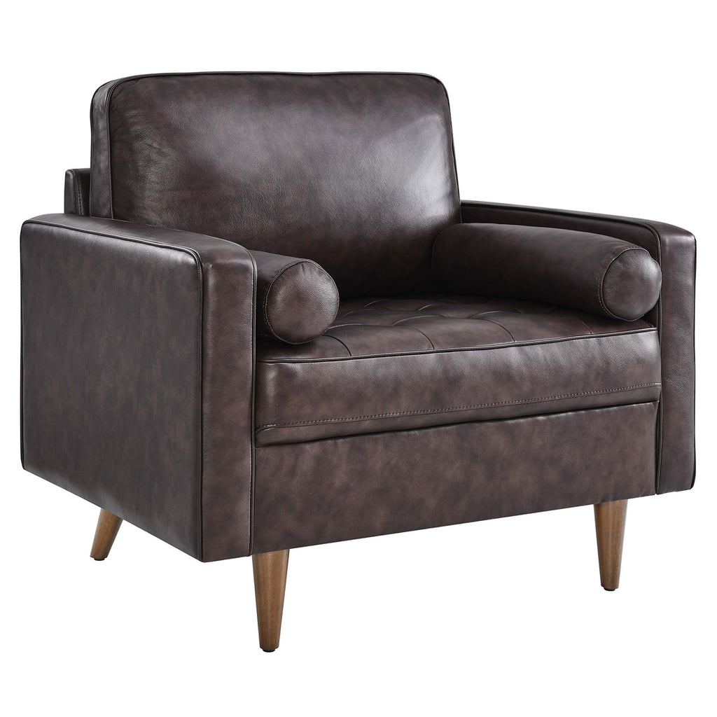 Update your home or apartment with the mid-century style and modern-day convenience of the Valour Leather Armchair. This comfortable armchair features a tailored profile with elegant biscuit tufting and two bolster pillows. Covered in beautiful top grain leather upholstery, this accent chair has dense foam padding, an innerspring pocket structure, and a sinuous spring support system for a comprehensive seating experience that fits perfectly into apartment settings. This luxe modern armchair comes with walnut-stained wood legs and non-marking foot caps to protect floors. Say goodbye to the days of hauling heavy furniture. This tufted armchair ships in a portable box for easy maneuvering. Weight limit: 330 lbs. Set Includes: One - Valour Leather Armchair