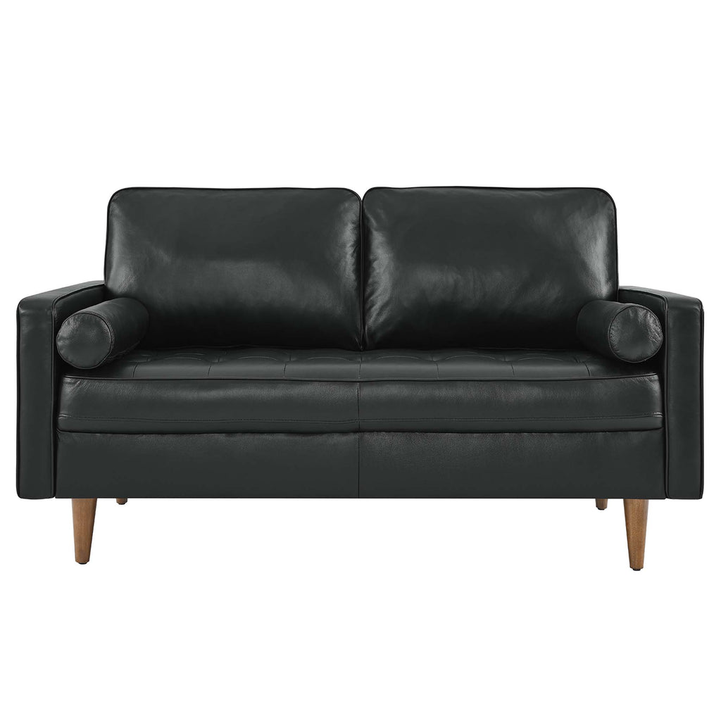Update your home or apartment with the mid-century style and modern-day convenience of the Valour Leather Loveseat. This comfortable two-seater sofa features a tailored profile with elegant biscuit tufting and two bolster pillows. Covered in beautiful top grain leather upholstery, Valour has dense foam padding, an innerspring pocket structure, and a sinuous spring support system for a comprehensive seating experience that fits perfectly into apartment settings. This luxe modern loveseat comes with walnut-stained wood legs and non-marking foot caps to protect floors. Say goodbye to the days of hauling heavy furniture. This tufted loveseat ships in a portable box for easy maneuvering. Weight limit: 660 lbs. Set Includes: One - Valour Leather Loveseat