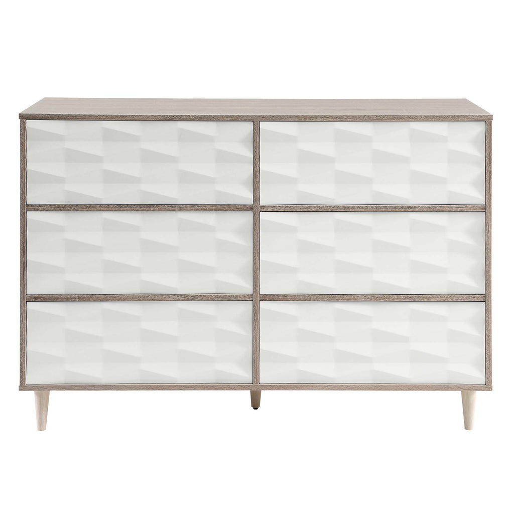 The Vespera 6-Drawer Dresser brings contemporary modern intrigue to the home or apartment featuring a grooved wave design on the front, tapered legs, and ample concealed storage space. Functional, beautiful, and streamlined, this spacious dresser stores clothes, linens, home essentials, and more without sacrificing style. A sturdy mindi wood and particleboard construction with a wood grain finish make it a durable addition in a variety of spaces in the home. Six full-glide drawers provide ample storage space and non-marking foot glides protect your flooring. Easy to follow assembly instructions included. PLEASE NOTE: For the greatest design pattern effect, please place the product in a well-lit room. Set Includes: One - Vespera 6-Drawer Dresser