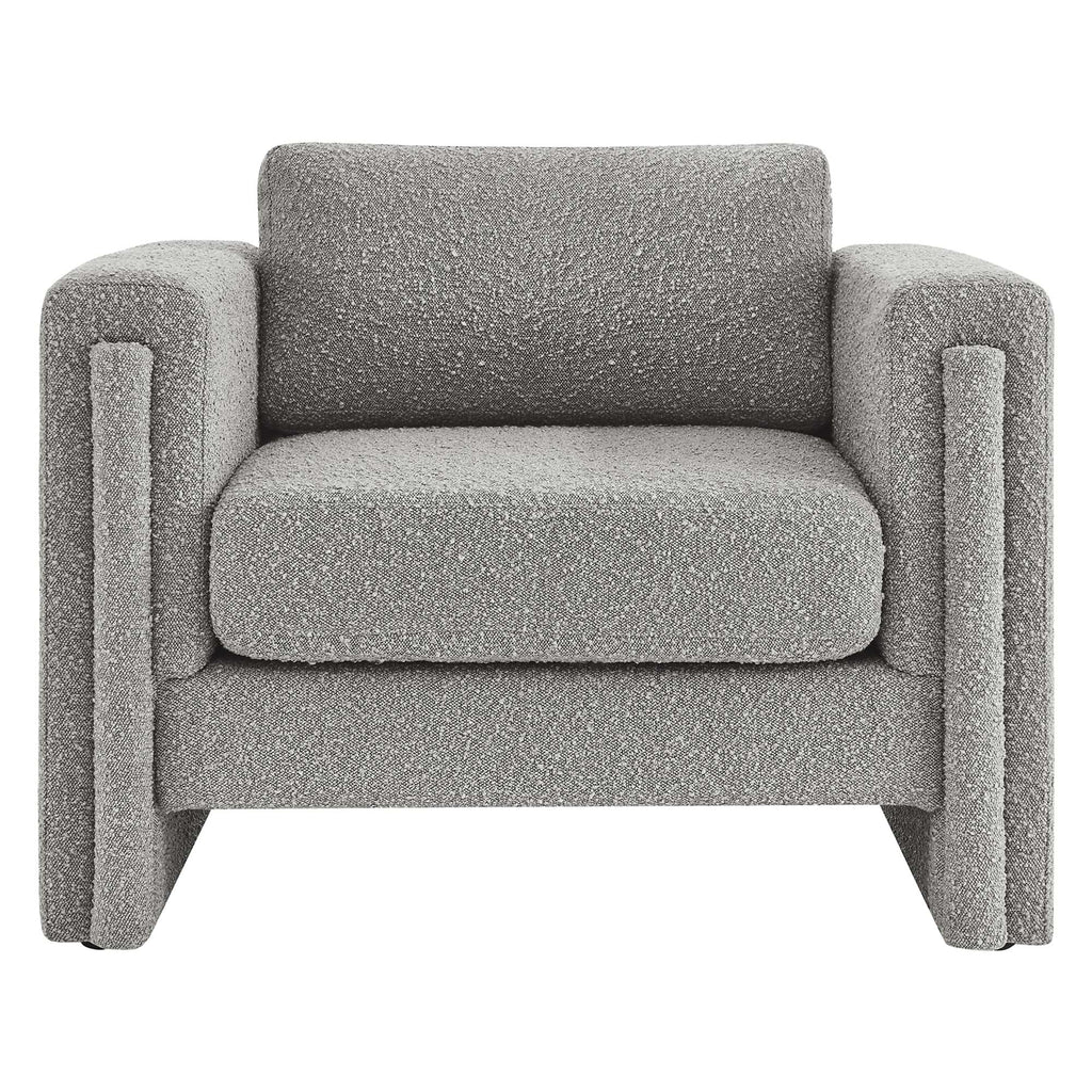 Indulge in the epitome of modern luxury and sophistication with the Visible Boucle Accent Armchair. Crafted with a sturdy wood and plywood frame, this armchair exudes modern elegance with its sleek lines and tailored silhouette. The adjustable non-marking foot pads protect your flooring while providing sturdy stability. Sink into cozy comfort with the dense foam padding and durable boucle fabric upholstery with a charming nubby texture. The cushions and cushion covers are removable to make cleaning a breeze. Enjoy unmatched support with the pocket coil springs that offer a premium seating experience. Assembly is required with easy to follow assembly instructions. Weight Capacity: 330 lbs. Set Includes: One - Armchair