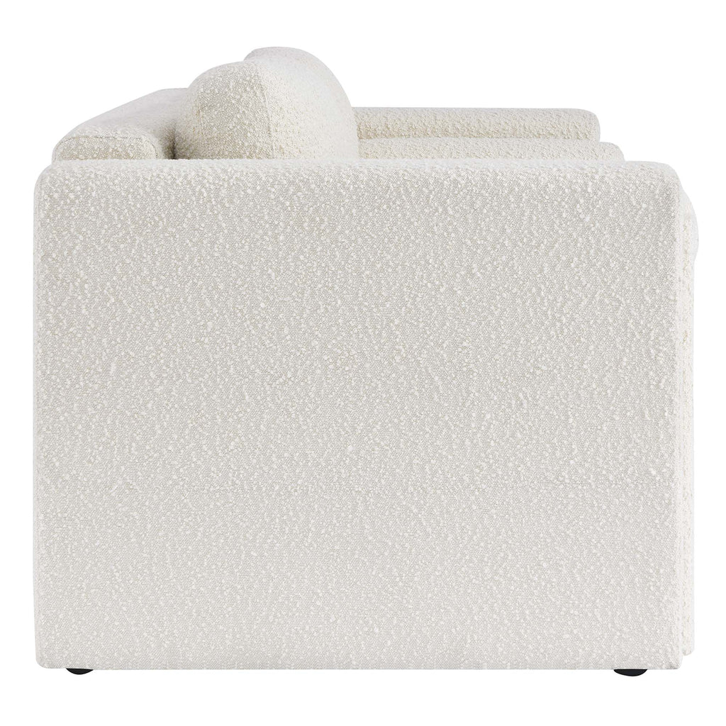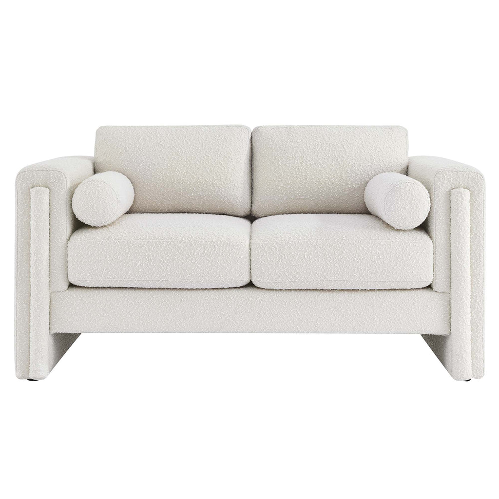 Indulge in the epitome of modern luxury and sophistication with the Visible Boucle Upholstered Loveseat. Crafted with a sturdy wood and plywood frame, this loveseat exudes modern elegance with its sleek lines, tailored silhouette, and bolster pillows. The adjustable non-marking foot pads protect your flooring while providing sturdy stability. Sink into cozy comfort with the dense foam padding, individualized pocket spring support, and durable boucle fabric upholstery with a charming nubby texture on this two-seater sofa. The cushions and cushion covers are zippered and removable. Enjoy unmatched support with the pocket coil springs that offer a premium seating experience. Assembly is required with easy to follow assembly instructions. Weight Capacity: 660 lbs. Set Includes: One - Loveseat