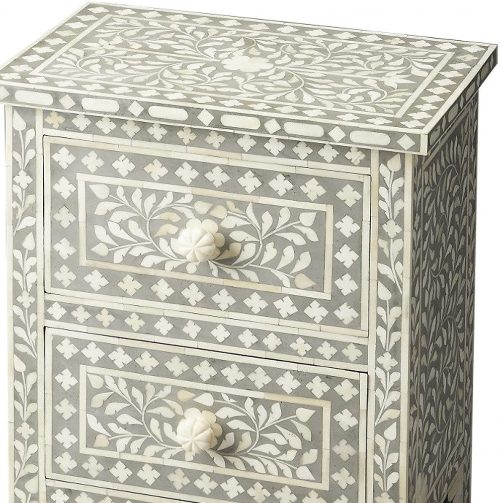 The elegance of the Indian subcontinent and thousands of years of artistisanry provide us with this contemporary two-drawer accent chest. Painstakingly handcrafted from wood solids and wood products, delicate bone inlay veneers, each pattern is hand-formed with unique design and unique delicacy, against a grey background. Complementary drawer pulls and carved leg braces provide character. This chest fits in any small space and provides an artistic showcase singly or in pairs.