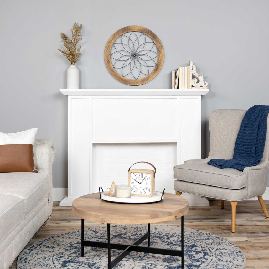 This rustic medallion decor is a must-have accent piece for your home. It flaunts a round floral-themed metal design, bordered by a wooden frame. The frame stands out with its natural grain and knot details, which also add texture to your walls.