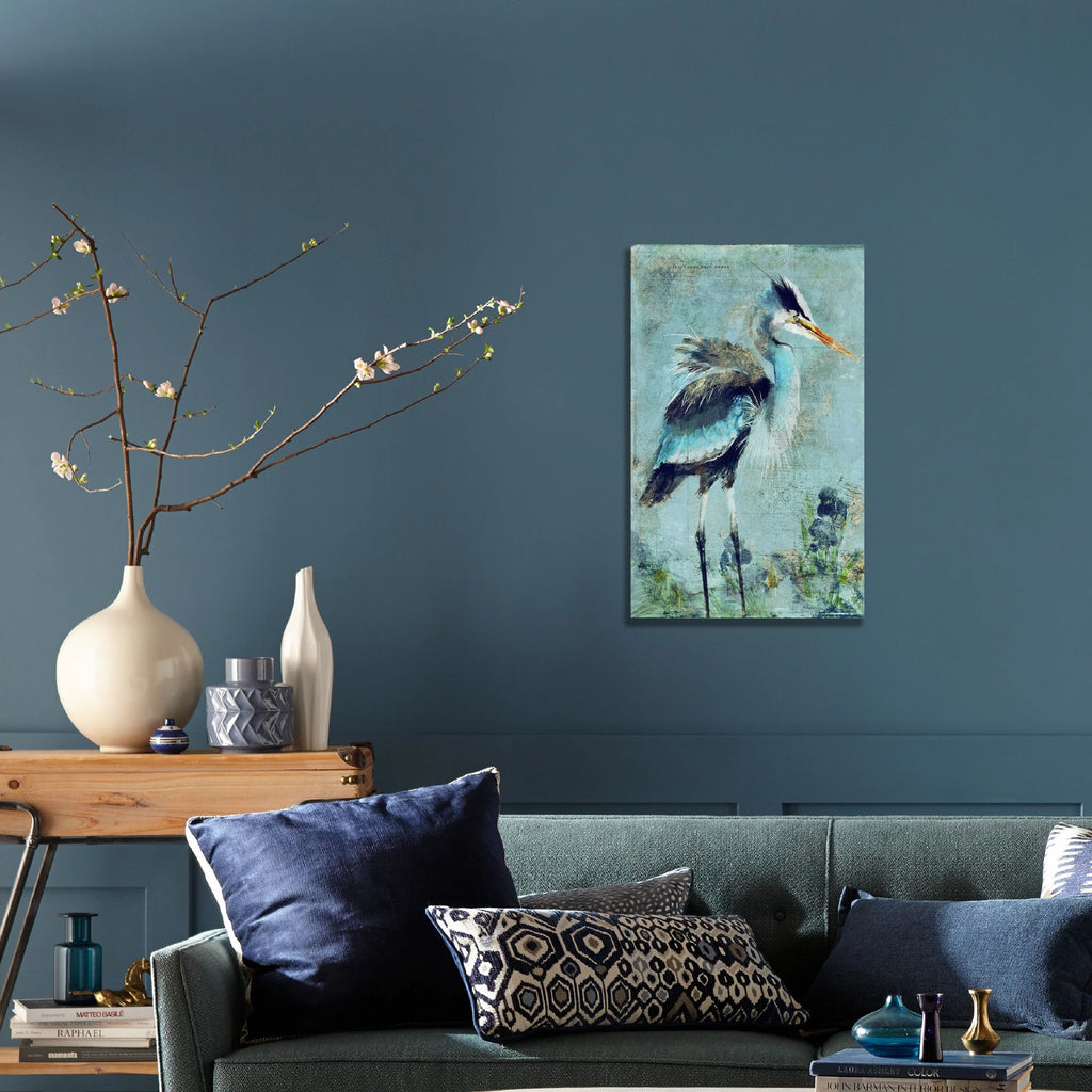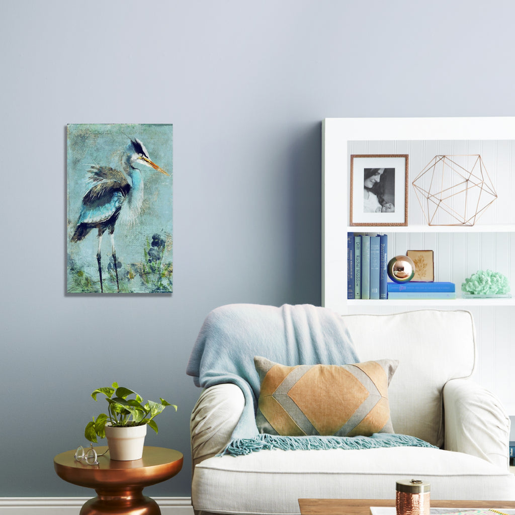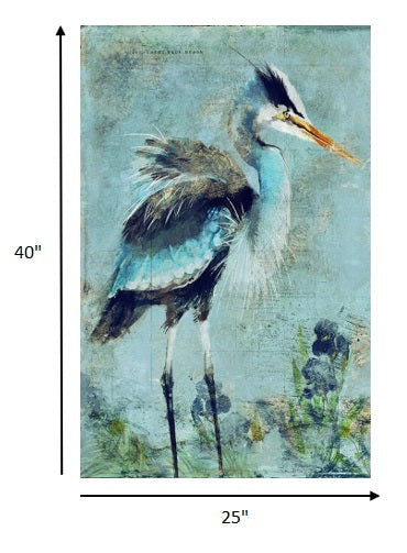 The Blue Watercolor Heron Wall Art features a big Heron painted in blue with the subtle background of a map. The print goes over distressed wood panels that include knots and other imperfections which enhance the rustic and vintage look of the wall art. This rectangular wall art is a unique addition to any beach house, living space, office, or bedroom. 25" x 40" x 2".