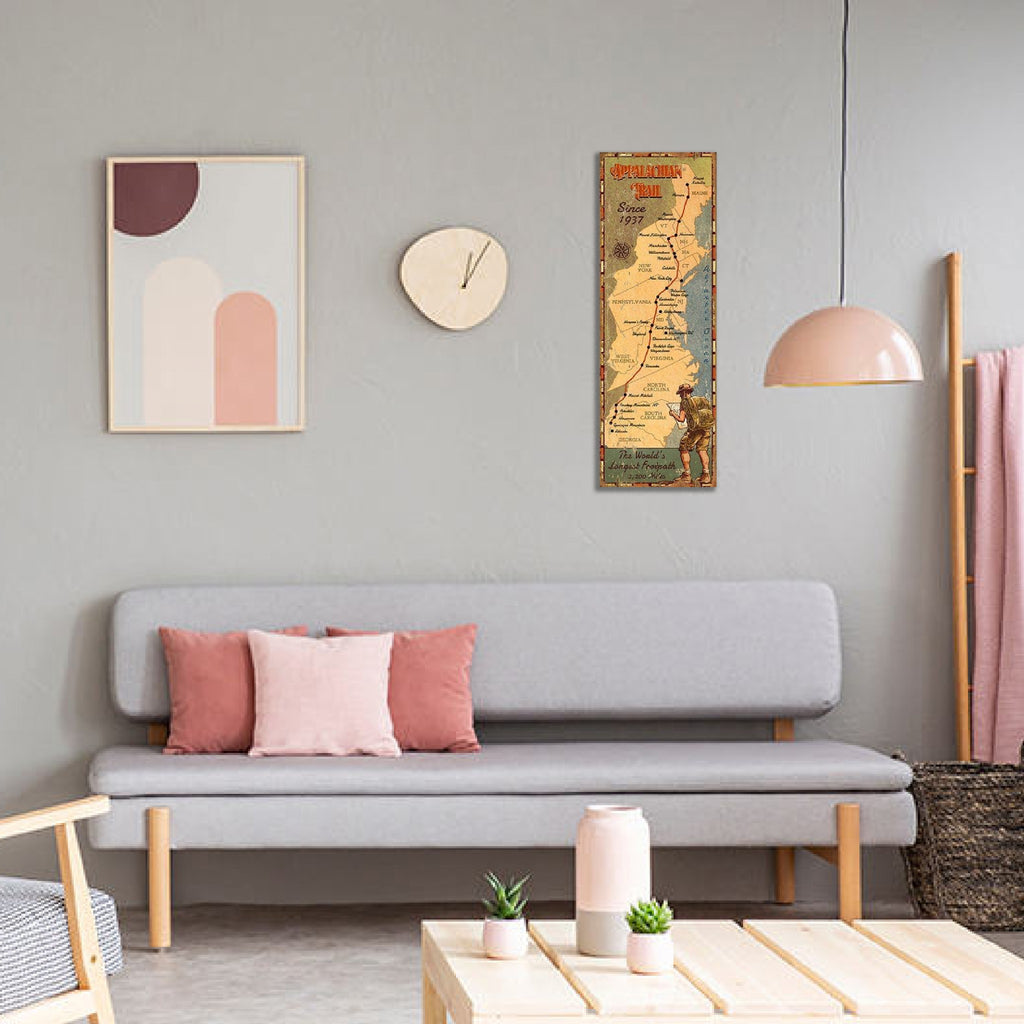 Historic and decorative, the c1937 Distressed Appalachian Trail Wall Art has a rustic look. A great gift for outdoorsy types, hikers and trail buffs, this vintage looking print will be a unique addition to your living room, office, or bedroom. 32" x 11" x 1"
