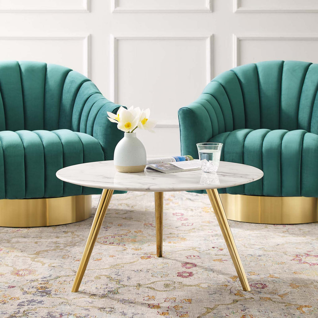 Reflecting a seamless organic shape and timeless form, the Lippa Table has become a symbol of modernism for over the past 60 years. Before its release, homes were filled with clunky remnants of an industrial age long gone by. But in order to advance into the new world, homes first had to transition from the traditional square table, into a piece that connoted progress. A twist on the original design, this coffee table features a round white faux marble table Top lacquered with a scratch-resistant finish and tripod base with tapered metallic gold dowel legs. This rendition of Lippa is a coffee table that's perfect for the living room, lounge area, or home office. Set Includes: One - Lippa 28" Round Coffe Table with Tripod Base