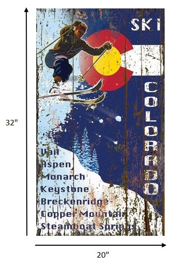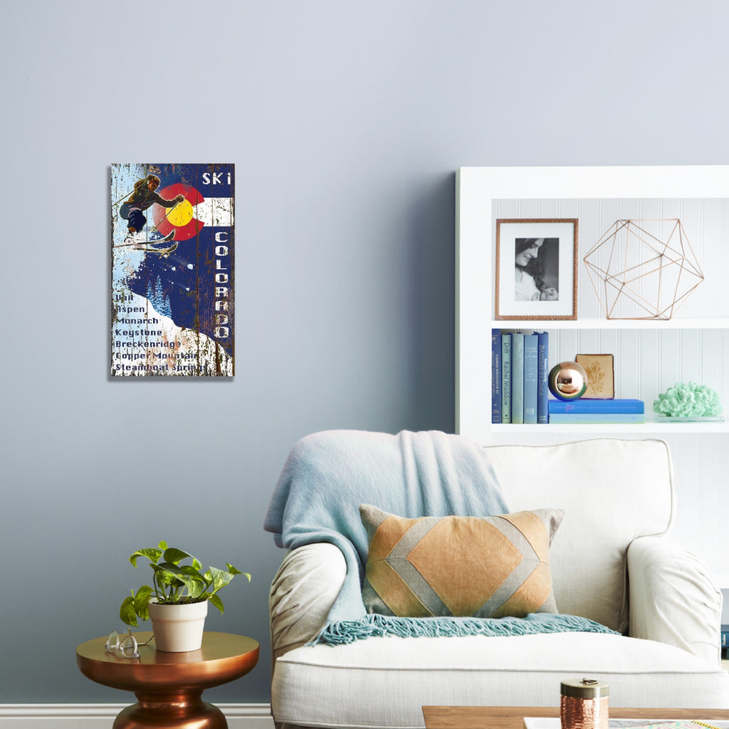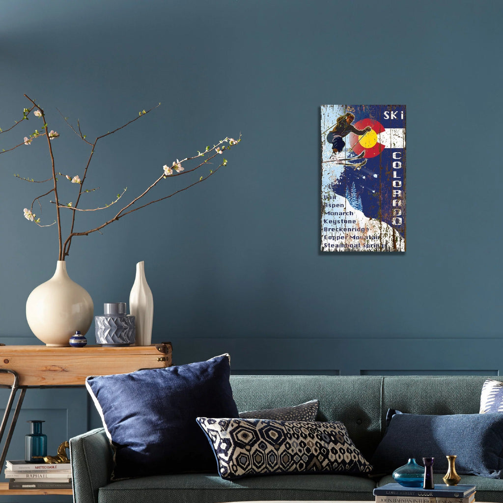 Rustic and imperfect by design, this Skiing into the Colorado Flag Wall Art is a unique and colorful way to bring some vintage Colordao memorabilia to your space. The vintage faded colors of red, blue, white and gold make the Colorado flag stand out. This vintage wall art is a unique addition to any mountain house, ski house, living space, or bedroom. 32" x 20" x 2".