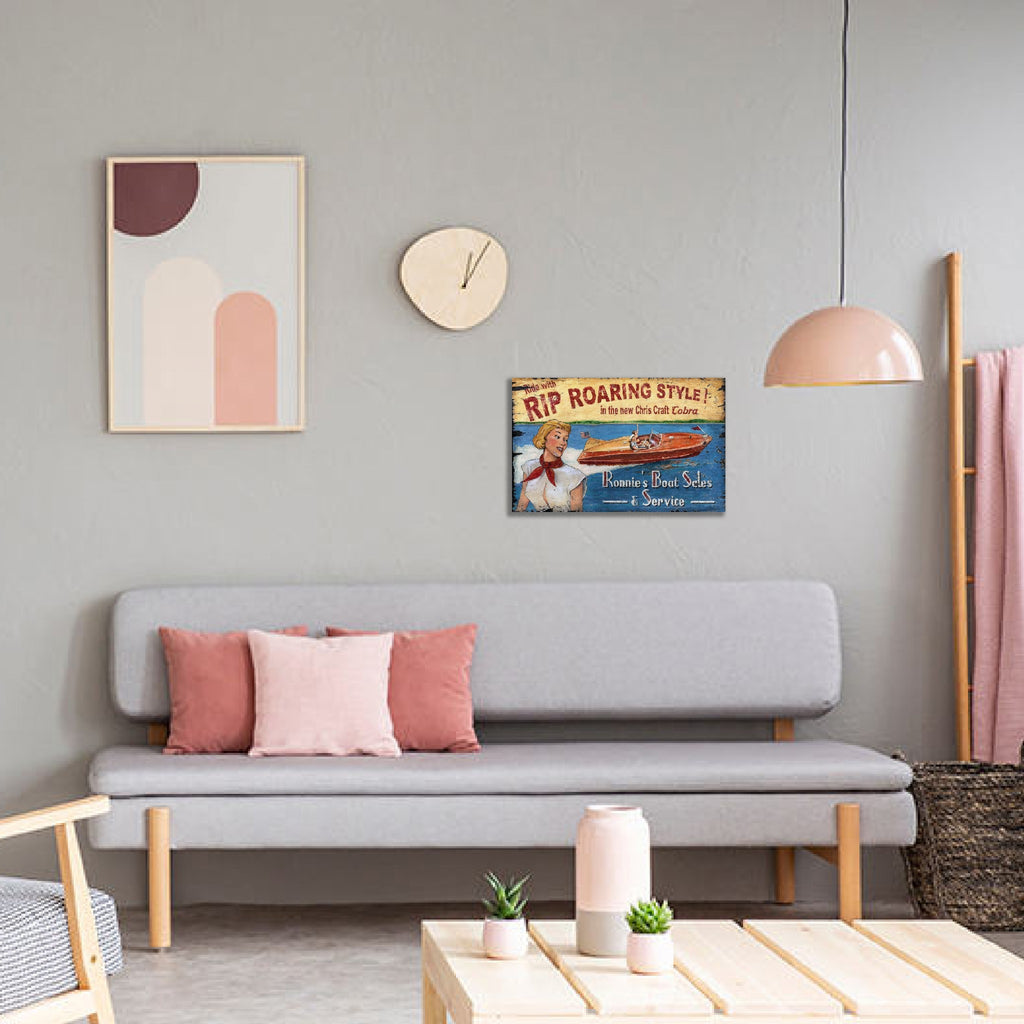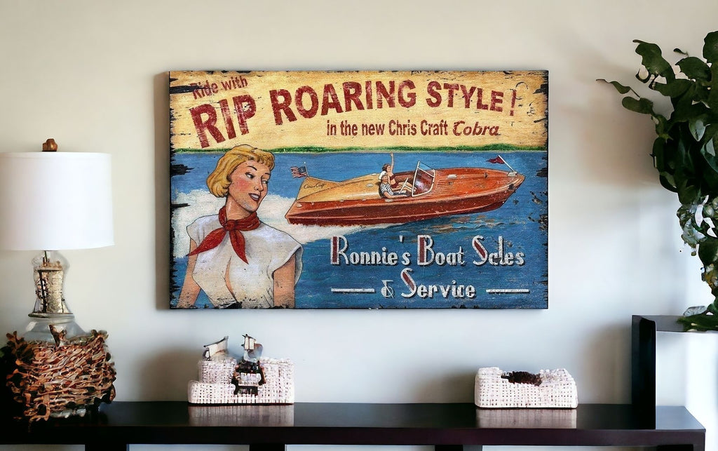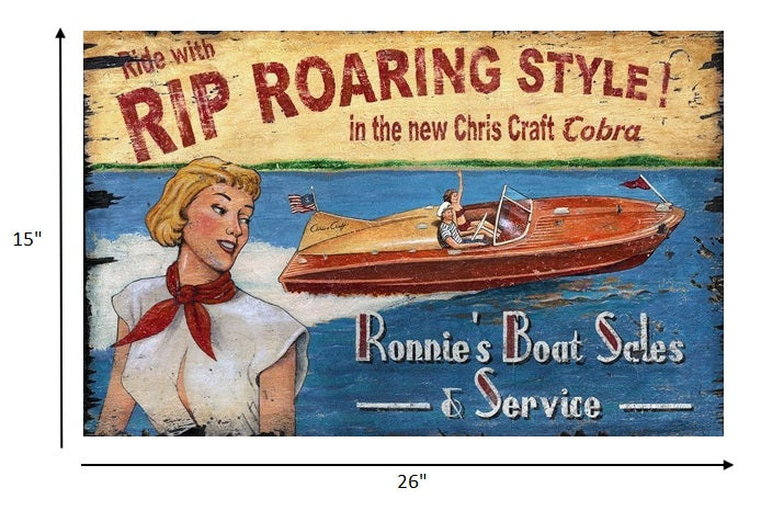 Colorful and distressed, the Vintage Style Boat Advertisement Wall Art is a fun and vibrant way to add some nautical beach motif to your space. This vintage advertisemnt is printed directly onto distressed wood panels that include knots and other imperfections that give this piece a vintage look and feel. A great piece for boat enthusiasts or beach nostalgia lovers. 15" x 26" x 2".