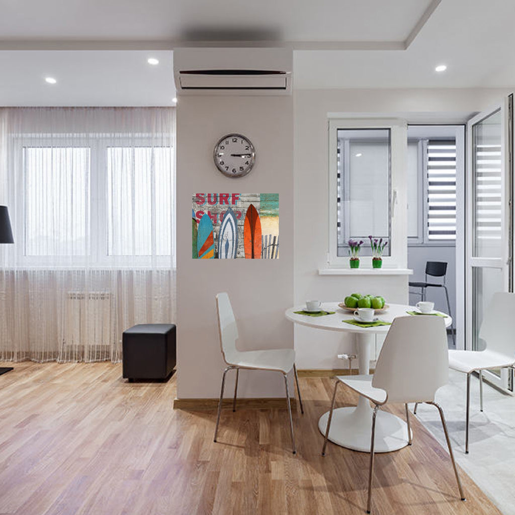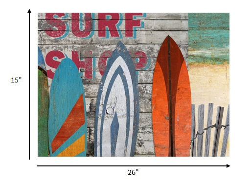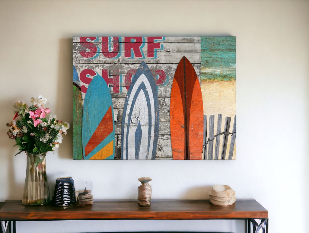 Have fun hanging around the surf shop with this fabulous and unique beach artwork. Our Vintage Surfboard Trio Beach Scene Wall Plaque is made from a rustic natural and distressed imperfect wood panel that we printed directly on to deliver a vibrant piece of art that is perfectly imperfect. The vibrant colors of this beach scene in a weathered vintage finish will be a great way to spice up your space. 15" x 26" x 2"