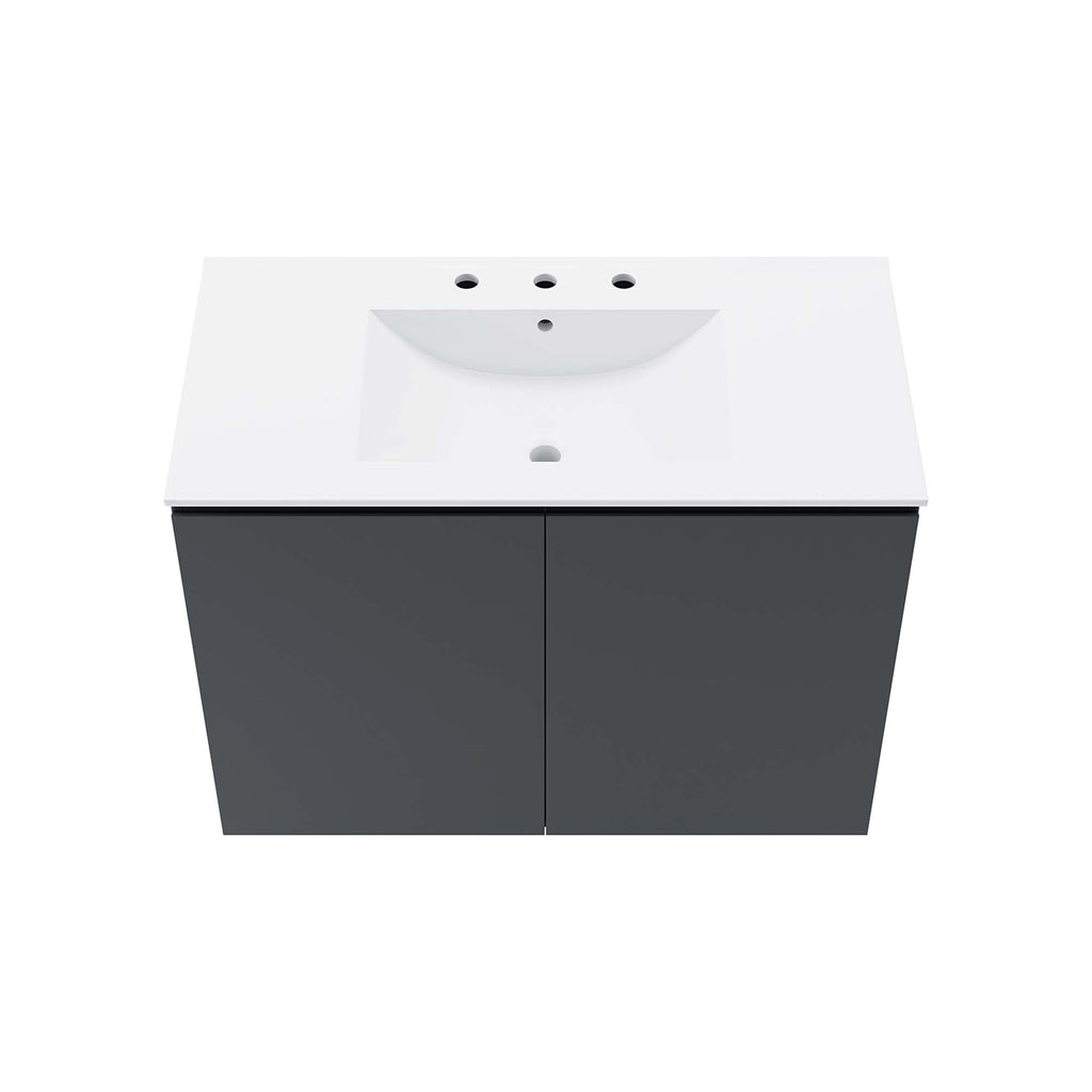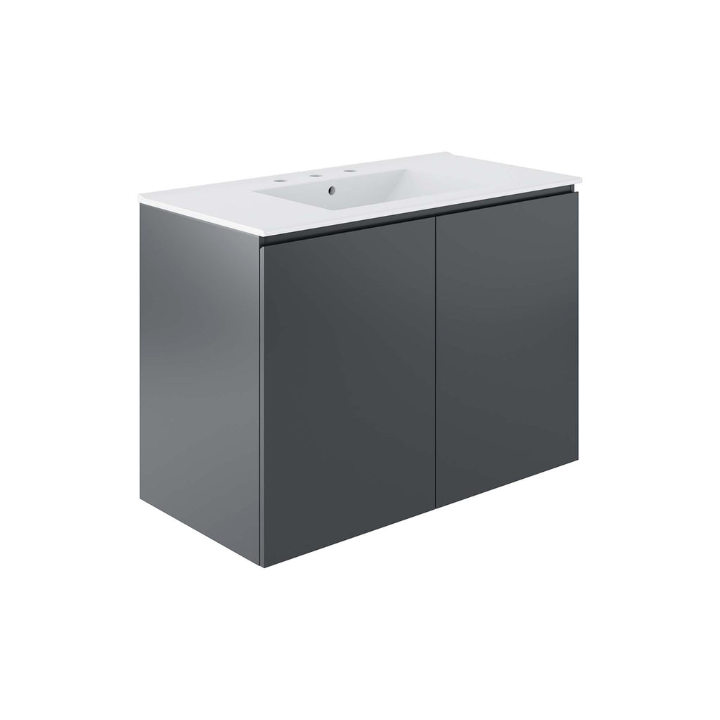 The sleek look and clean-lined silhouette of the Bryn 36" Wall-Mount Bathroom Vanity add modern style to your bathroom space. Durably crafted with particleboard and melamine, this vanity mounts directly to the wall and features ample storage space under the sink behind two soft-close doors. Bryn features a cut-out design to accommodate plumbing. This vanity is complete with a ceramic sink basin with 8-inch centerset holes and an integrated countertop. Fixtures not included. Assembly required. Set Includes: One - Bryn 36" Wall-Mount Bathroom Vanity