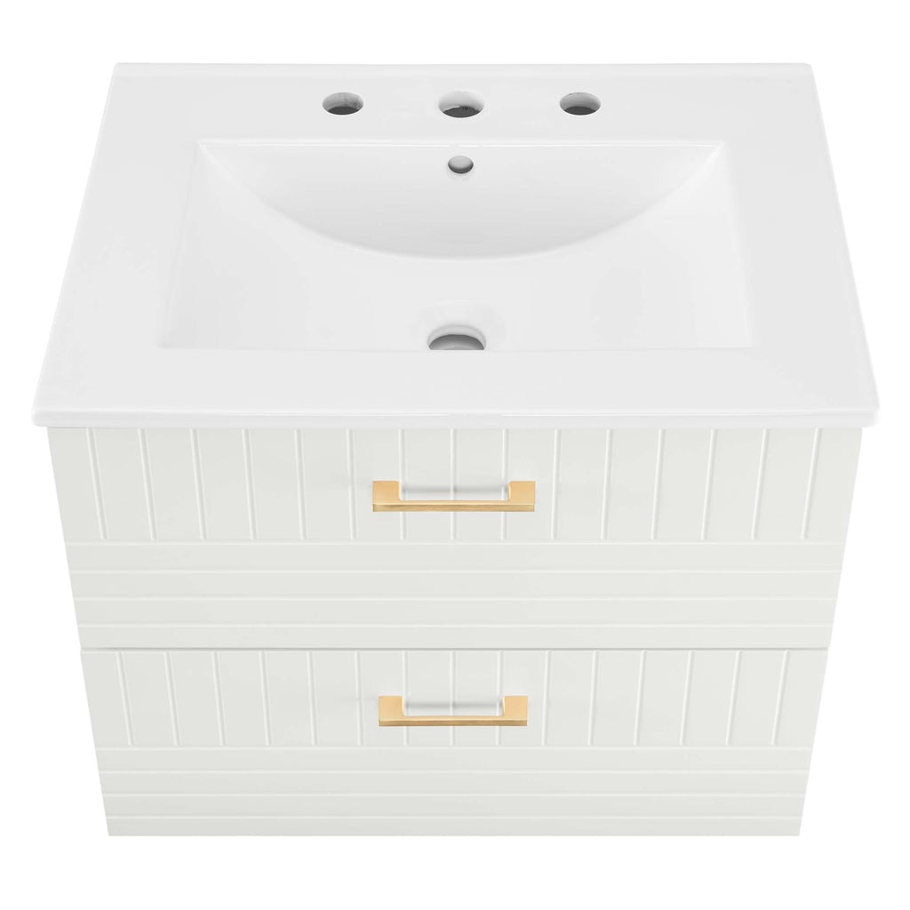 Refresh your bathroom space with the contemporary style of the Daybreak 24" Bathroom Vanity. Featuring a modern silhouette, sophisticated matte finish, and brushed gold metal hardware, this vanity is durably crafted with a blend of rubberwood, MDF, and particleboard to create a lasting vanity for your bathroom. Raised off the ground by gold metal legs, this bathroom vanity is complete with ample storage in its spacious drawers to accommade bathroom essentials and features a special design for plumbing. The vanity comes with a ceramic sink basin with 8-inch centerset holes and an integrated countertop. Includes non-marking foot caps. Assembly required. Fixtures not included. Set Includes: One - Daybreak 24" Bathroom Vanity