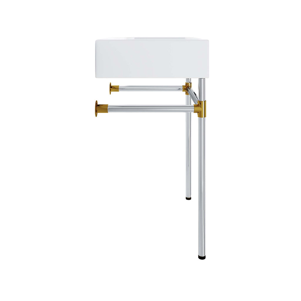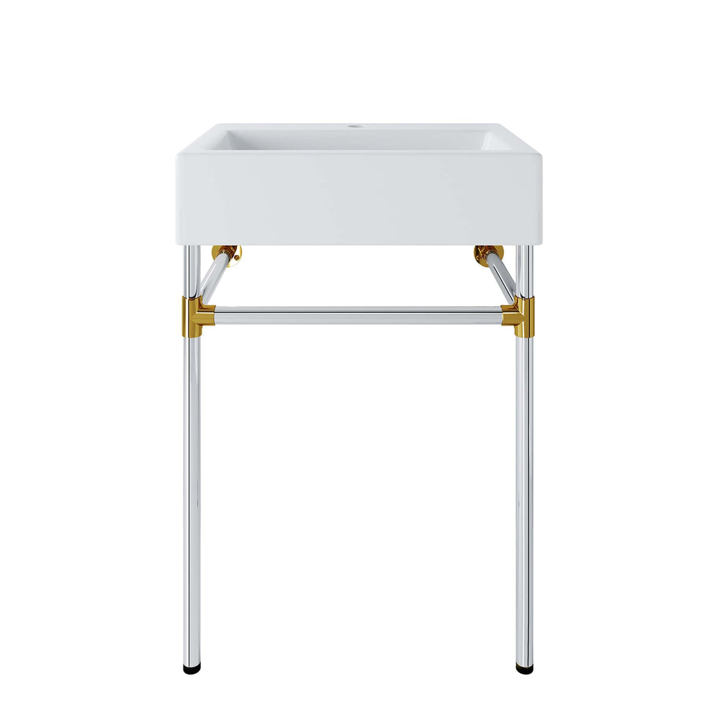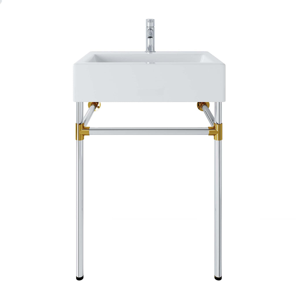 Create a bathroom oasis with the minimalist style and efficiency of the Redeem Wall-Mount Silver Stainless Steel Bathroom Vanity. The glossy white ceramic basin and robust stainless steel frame affix directly and securely to the bathroom or powder room wall. Redeem dispenses gentility in spaces large and small, resting confidently on a sturdy silver metal frame with gold joints for added stability. This small bathroom vanity has a single faucet hole and is outfitted with non-marking foot caps to protect your bathroom floor. Assembly required and fixtures not included. Set Includes: One - Redeem 24" Silver Stainless Steel Wall-Mount Bathroom Vanity