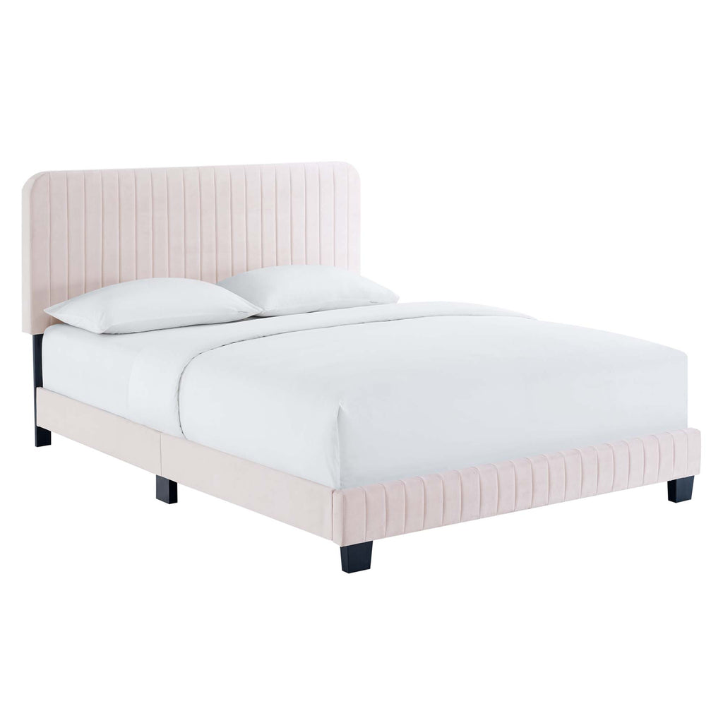 Elevate your master bedroom or guest bedroom style with the luxe texture and glam deco elegance of the Celine King Platform Bed. Adorned with channel tufted detail, the king size headboard of this upholstered bed is padded in dense foam to offer supportive comfort while sitting up resting, relaxing, reading, or watching TV. Upholstered in stain-resistant performance velvet, this platform bed eliminates the need for a box spring with a wood slat support system to allow for ample air circulation and a reinforced center beam and support legs for added durability. A sturdy mattress foundation, this king size platform bed accommodates a variety of mattress styles including innerspring, memory foam, and latex. Assembly required. Weight Limit: 800 lbs. Set Includes: One - Celine Channel Tufted Performance Velvet King Platform Bed