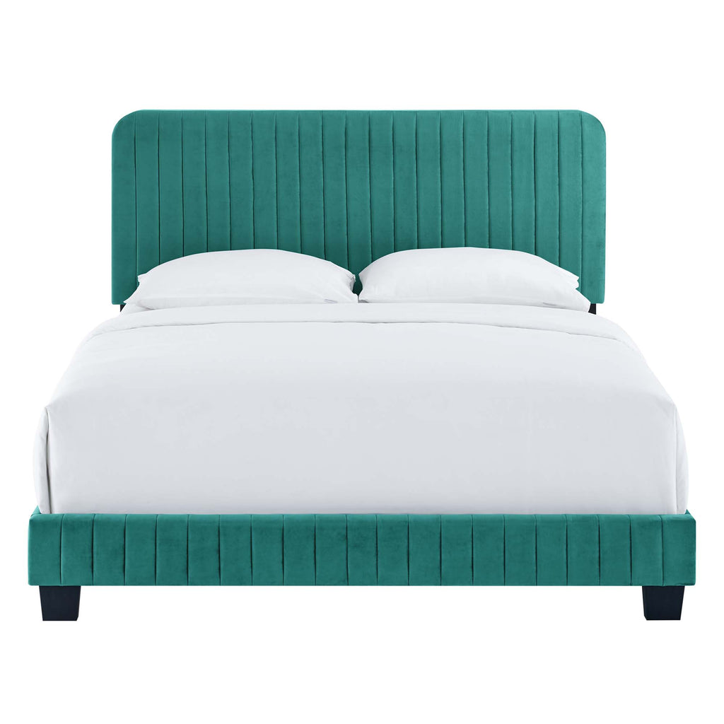 Elevate your master bedroom or guest bedroom style with the luxe texture and glam deco elegance of the Celine King Platform Bed. Adorned with channel tufted detail, the king size headboard of this upholstered bed is padded in dense foam to offer supportive comfort while sitting up resting, relaxing, reading, or watching TV. Upholstered in stain-resistant performance velvet, this platform bed eliminates the need for a box spring with a wood slat support system to allow for ample air circulation and a reinforced center beam and support legs for added durability. A sturdy mattress foundation, this king size platform bed accommodates a variety of mattress styles including innerspring, memory foam, and latex. Assembly required. Weight Limit: 800 lbs. Set Includes: One - Celine Channel Tufted Performance Velvet King Platform Bed