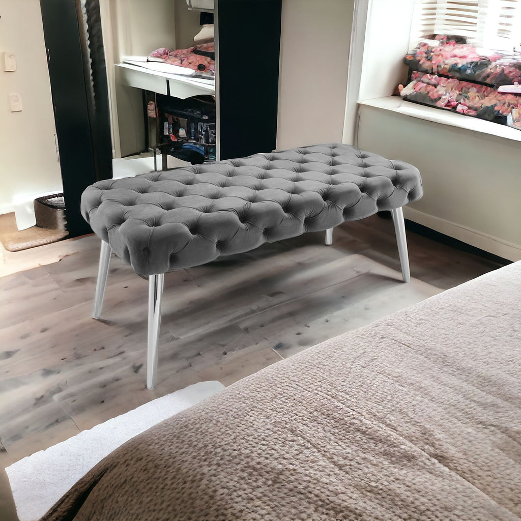 Distinctive in style the 48" gray and silver upholstered velvet bench radiates a versatile charm. The gray upholstery top of this bench is a nice contrast to the high quality, silver metal of the base. Expertly upholstered with padding in a soft solid color velvet, this bench is as comfortable as it is good looking. Adding this bench to the end of your bed is a great idea to help you get ready in the morning. Benches don't have to be unsightly. Increase your seating and the fashion quotient of your room all at the same time with this hard wearing, versatile, and good looking bench. 20.5" H x 48.4" W x 20.9" D