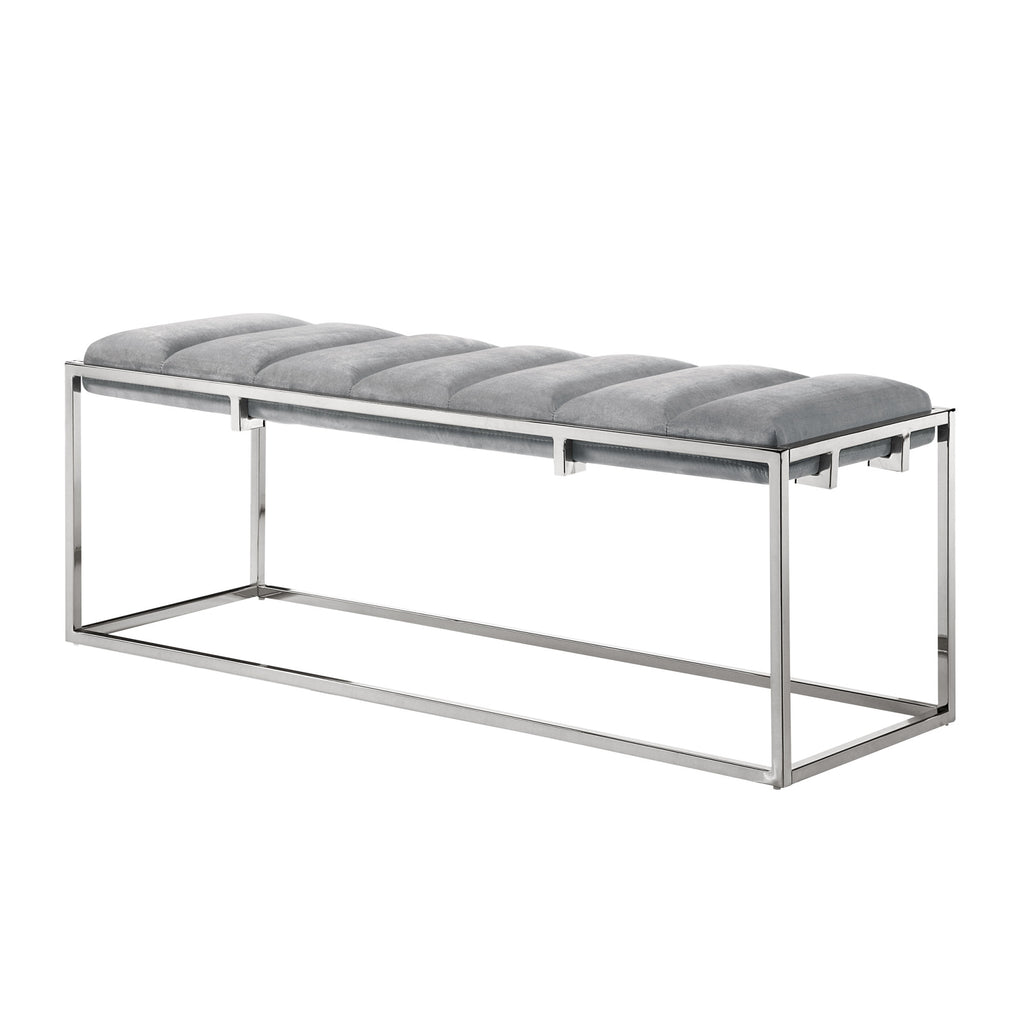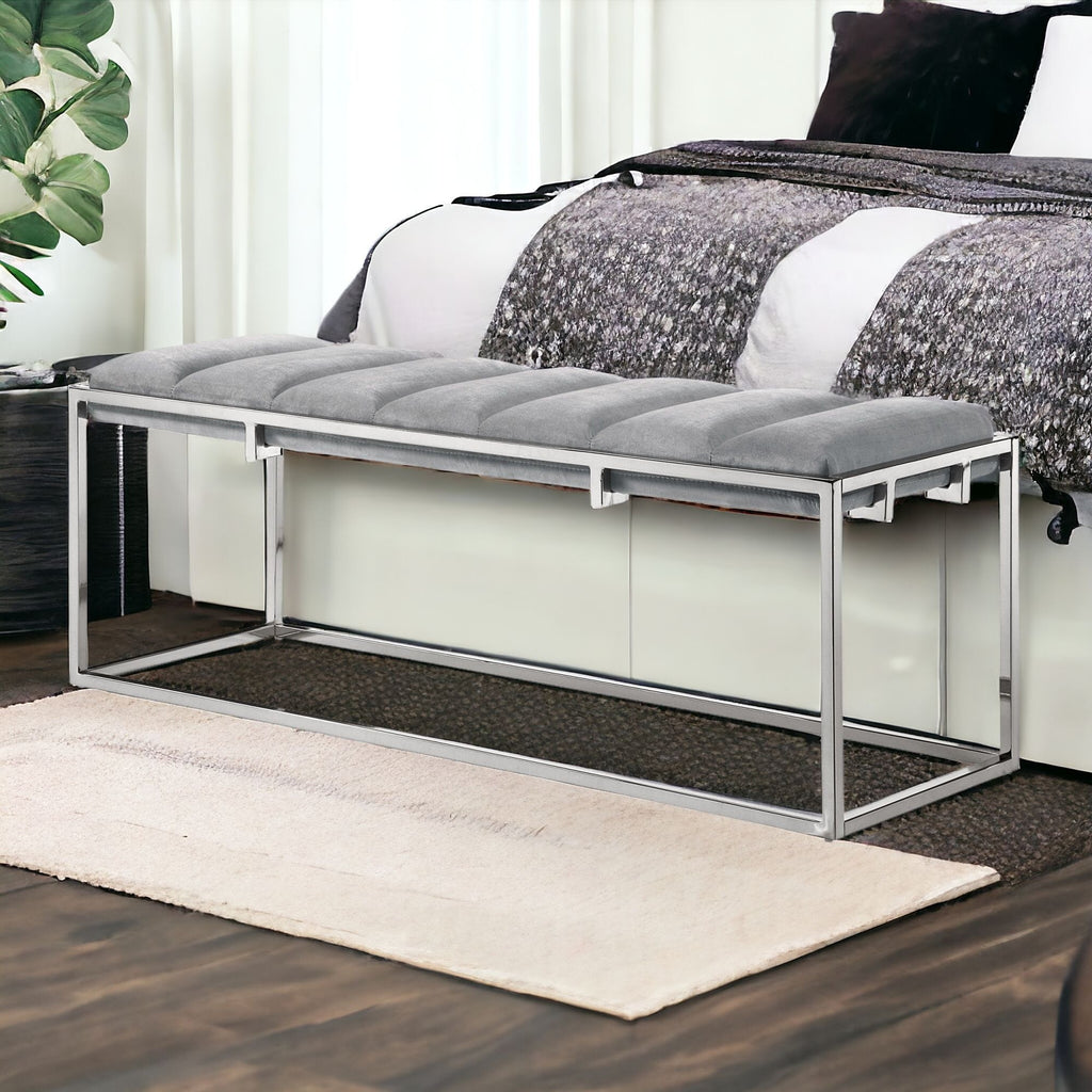 Add a good looking decorative accent to your space that is also practical for seating. The gray upholstery top of this bench is a nice contrast to the high quality, silver metal of the base. Expertly upholstered with padding in a soft solid color velvet, this bench is as comfortable as it is good looking. Adding this bench to the end of your bed is a great idea to help you get ready in the morning. Easy to blend into most any room, a bench is a way to add a good looking accent to your space that can also be practical and useful. . 18.5" H x 50" W x 16.5" D