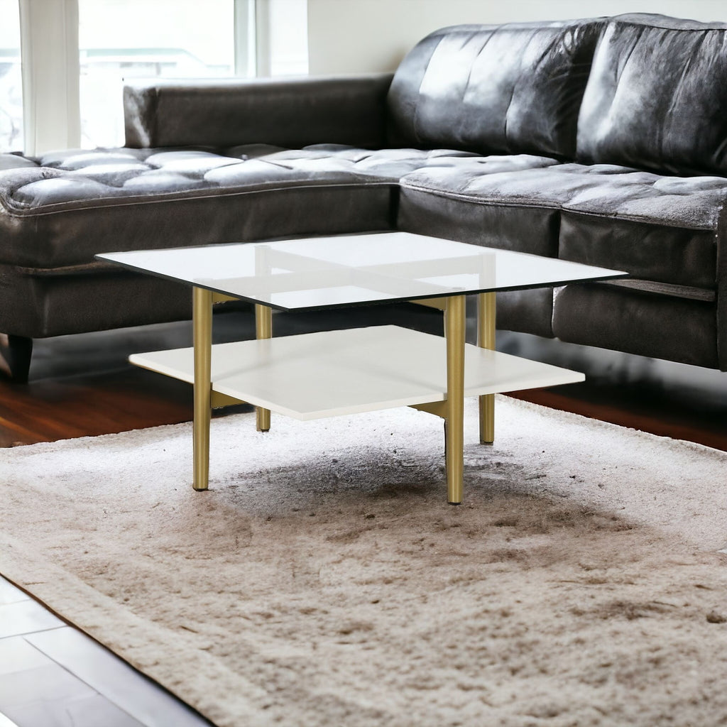 32" White And Gold Glass And Steel Square Coffee Table With Shelf