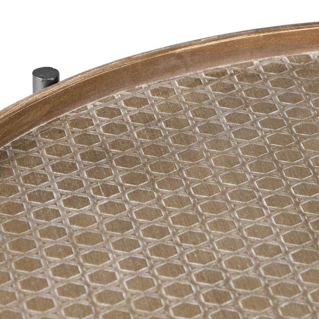 Add beautiful modern theme to your home with this exceptional coffee table. Made of reclaimed wood with alluring brown finish, the table is sure to catch everyones attention. The table comes with round mirrored top with raised edge to keep items from rolling off. Balanced on sturdy legs, this table provides a lovely way to serve beverages or display magazines in the living room and will add variation to your decor. Dimensions: 33".
