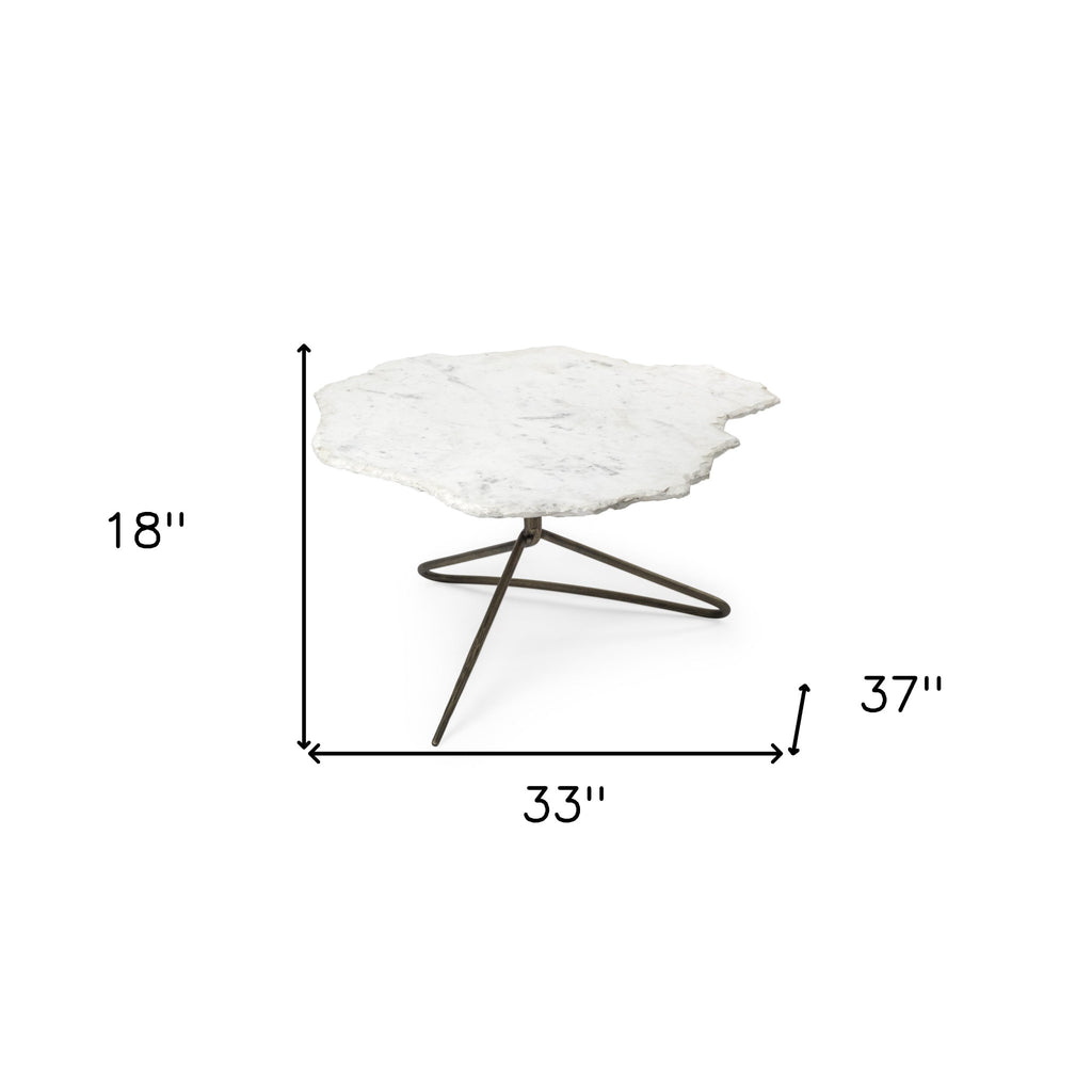 This good looking 33-inch white and gold genuine marble and iron free form coffee table is not only practical, but good looking and built to last. The gold coloration of the high quality iron base marries nicely with the white genuine marble top surface. This free form table utilizes its unique shape to give your room a modern geometric accent. If you're looking for something that can fit into a living area, bedroom, or office, this coffee table is for you. This coffee table is the sturdy, reliable and stylish answer to your living room needs. 18-inch H x 33-inch W x 37-inch D