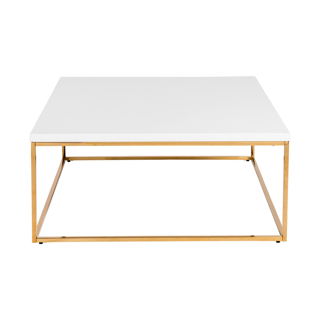 Make your living room or family room really stand out with this 35" gold and white manufactured wood and metal square coffee table. A gold metal frame is finished off with a white manufactured wood top that is the epitome of quality construction and design. This square table features a fresh and stylish shape to give your room a visually pleasing accent. If you're looking for something that can fit into a living area, bedroom, or office, this coffee table is for you. This coffee table is the sturdy, reliable and stylish answer to your living room needs. 15.75" H x 35.44" W x 35.44" D