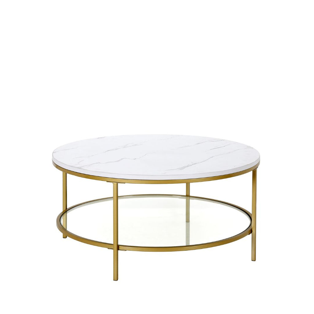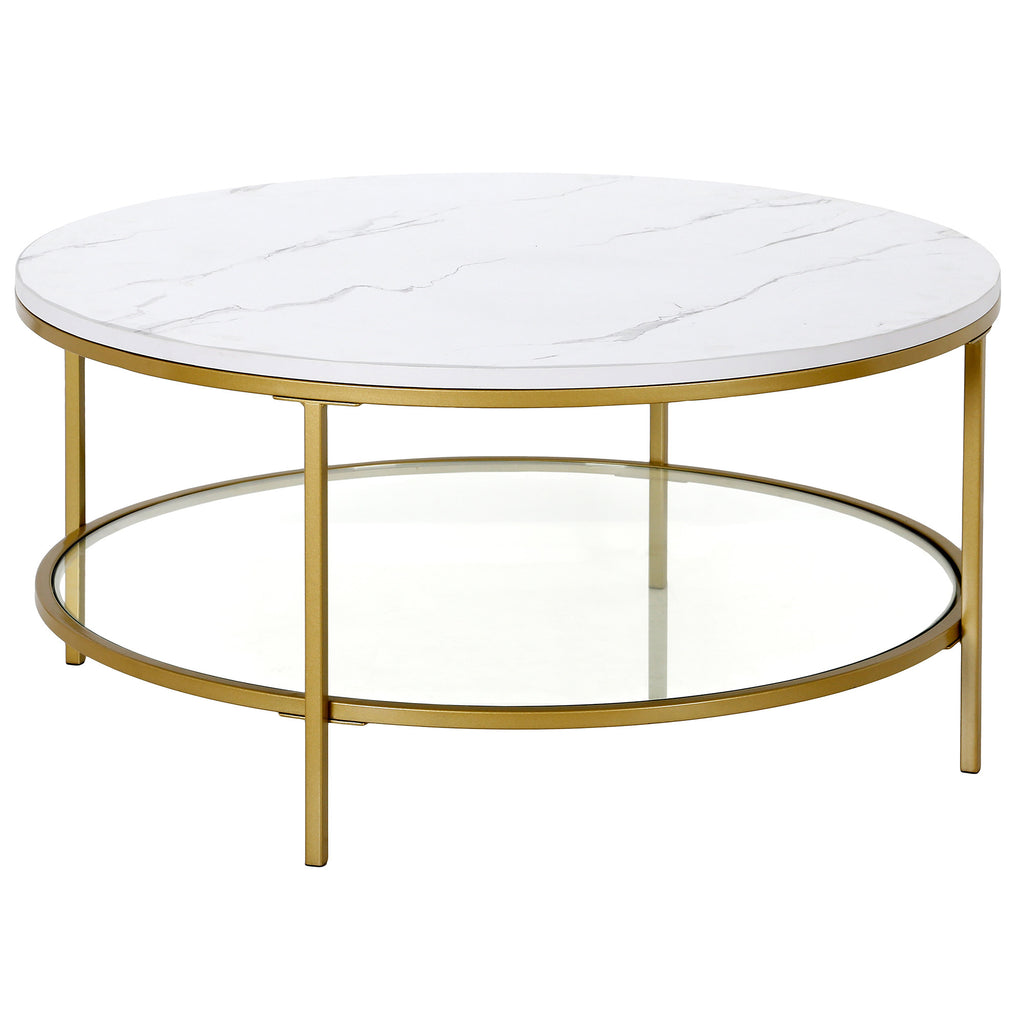 36" Gold Faux Marble And Steel Round Coffee Table With Shelf
