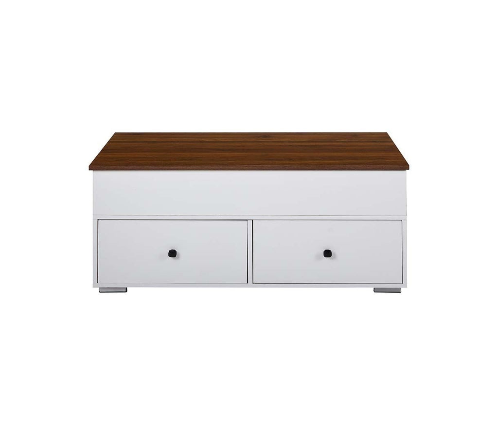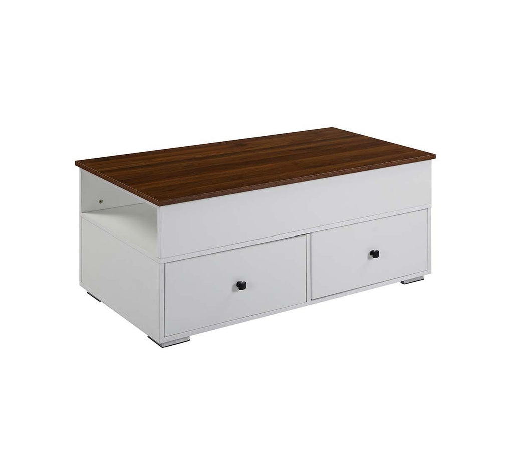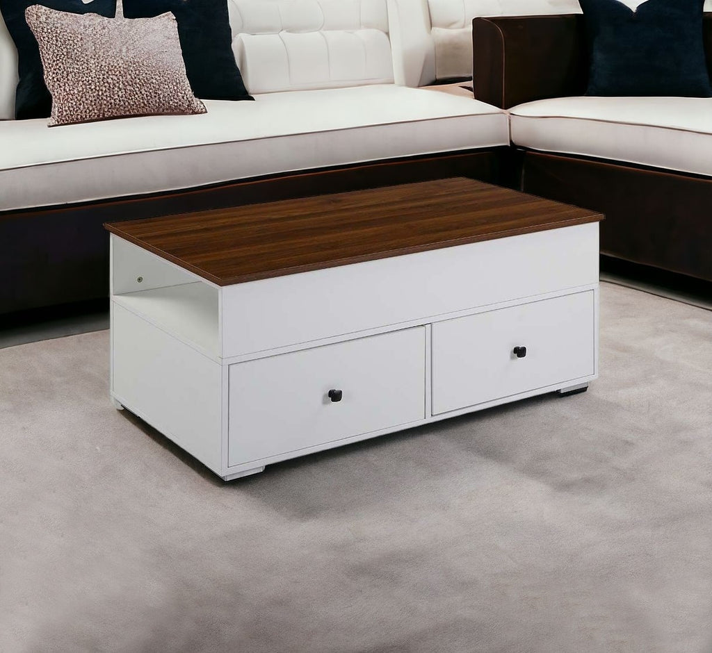 46" White And Walnut Lift Top Coffee Table With Two Drawers And Shelf