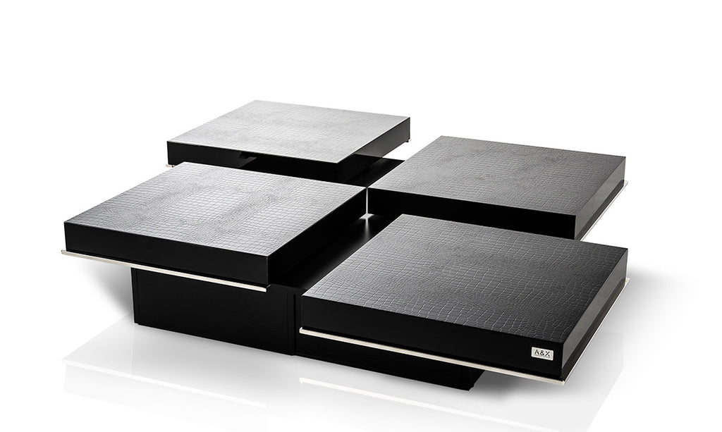Add a stunning contemporary look to your space with this high gloss Black Faux Croc Lacquered Square Coffee Table. This square table features a fresh and stylish shape to give your room a visually pleasing accent that is extremely unique with four squares that pull out to offer a multi level surface. If you're looking for something that can fit into a living area, bedroom, or office, this coffee table is for you. This coffee table is the sturdy, reliable and modern answer to your living room needs. 12" H x 47" W x 47" D