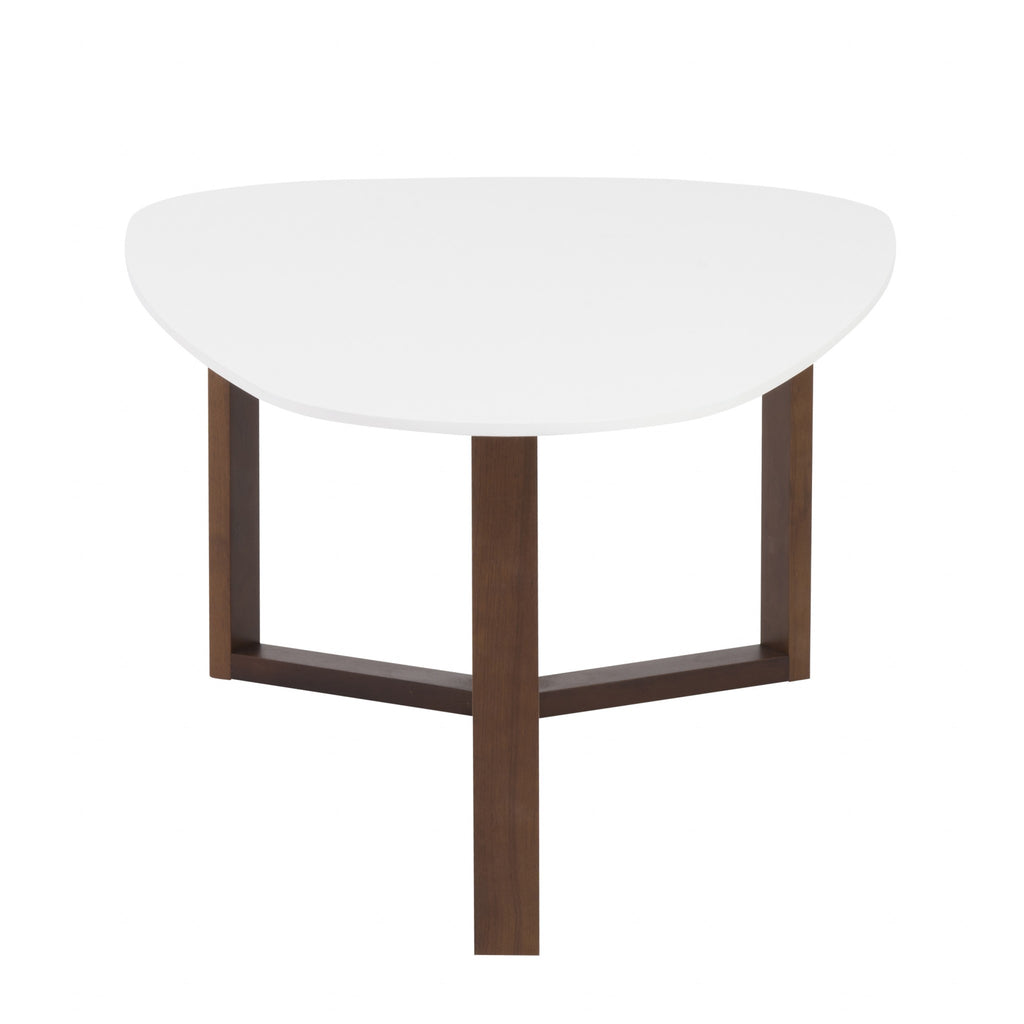 This coffee table boasts a triangular-shaped beautiful white matte lacquer finished MDF top supported by connecting walnut powder-coated steel legs which makes it not only functional but expresses an artistic element as well.