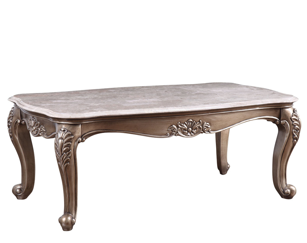 Stylish and super sturdy, the 52-inch champagne faux marble and solid and manufactured wood coffee table is an amazingly good looking coffee table that will compliment your living room. This rectangular table is an classic yet updated way to accent your room. Queen anne legs are a sign of high quality and classic construction. It has a fresh design that will definitely breathe some fresh air into your interior. This coffee table is the sturdy, reliable and stylish answer to your living room needs. 20-inch H x 52-inch W x 32-inch D